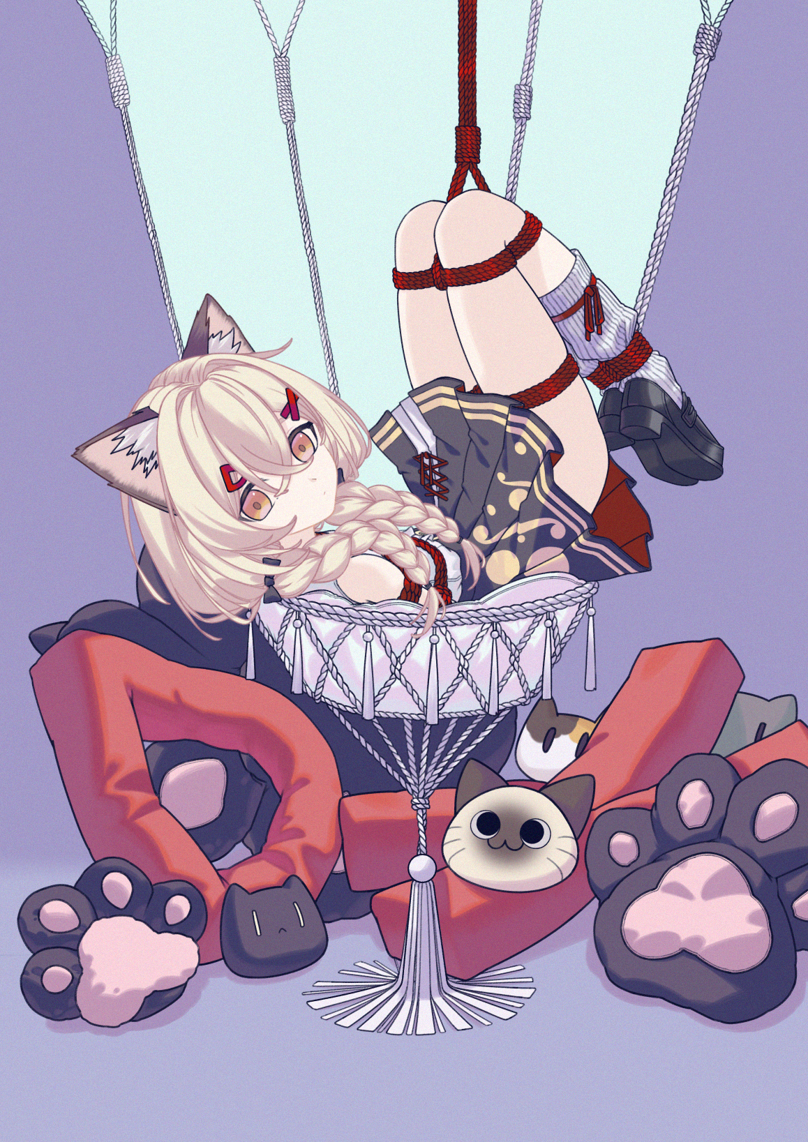 1girlanimal earsblack skirtblonde hairboundbound armsbound legsbraidloaferslooking at viewerlyingmedium hairon backpillowshibarishibari over clothesshoesskirtsolotied up (nonsexual)twin braidsyellow eyes