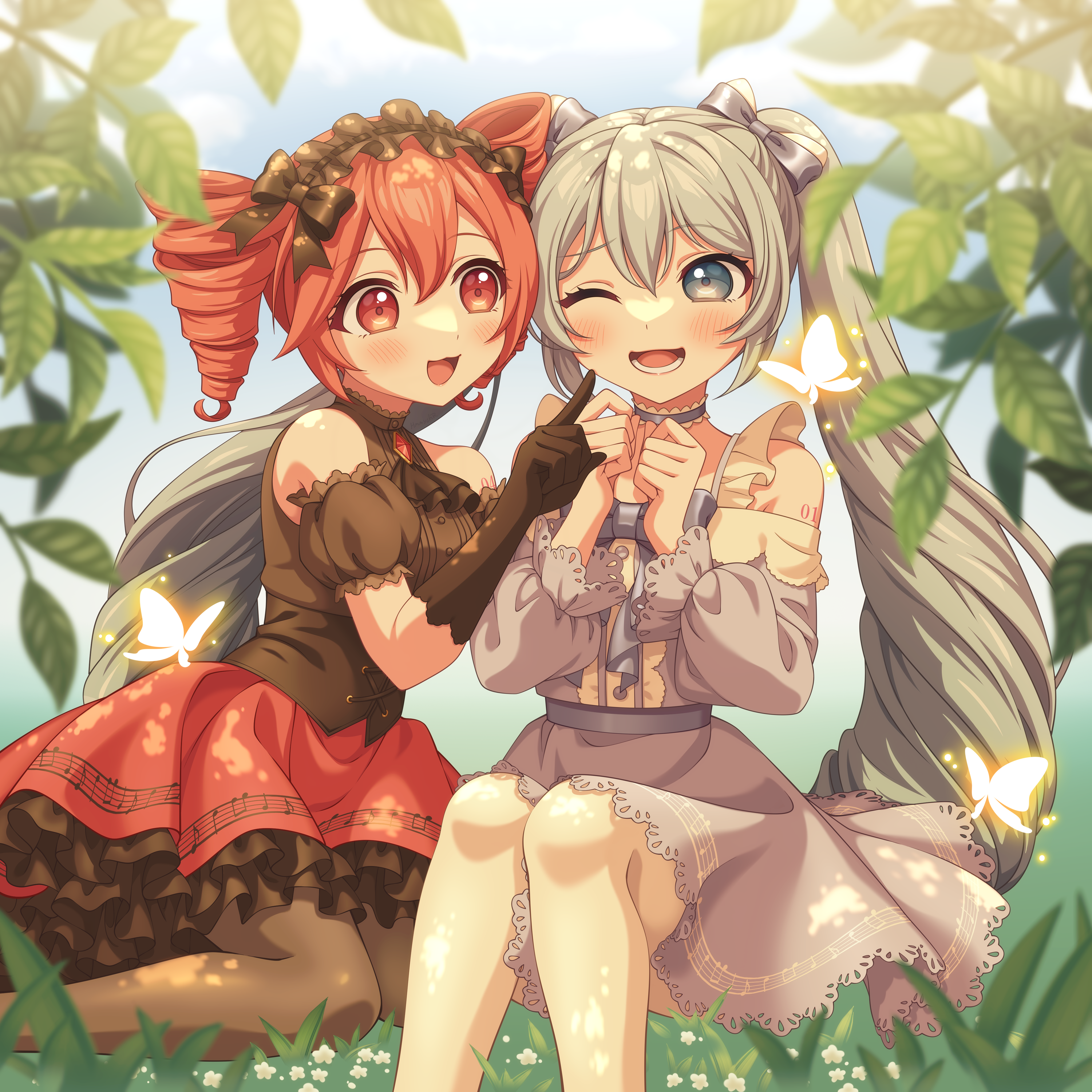 2girlsaqua eyesaqua hairarm tattooblack bowblack dressblack glovesblack pantyhoseblue bowblue dressbowdetached sleevesdressdrill hairfrilled hairbandfrillsgloveshair between eyeshair ornamenthairbandlong hairlong sleeveslooking at anothermultiple girlsmusical notemusical note printmusical staffmusical staff printnumber tattooone eye closedopen mouthpantyhosepuffy short sleevespuffy sleevesred eyesred hairshort sleevessittingsmiletattootwin drillstwintailsvery long hair