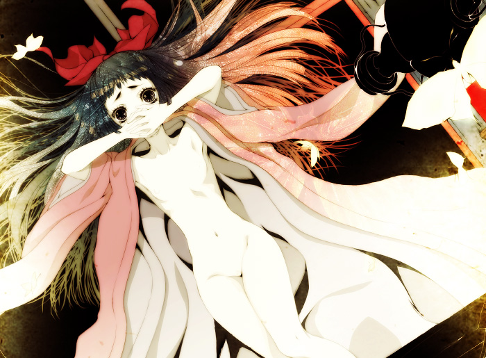 1girlblack hairbowcovering own mouthfemale focushair bowhand over mouthhand over own mouthjapanese clotheslong hairlyingno nipplesnudepale skinsolo