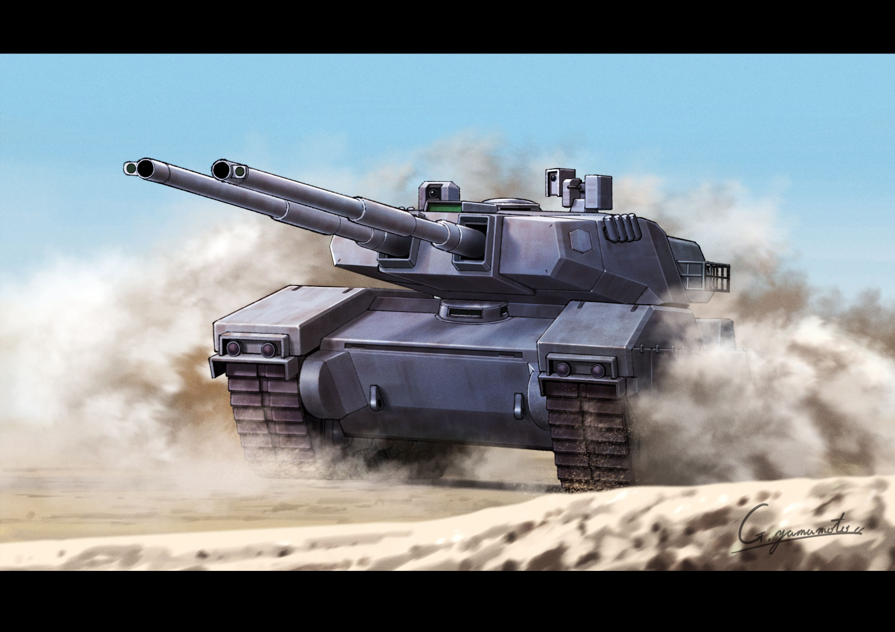 blue skycaterpillar tracksclear skydaydesertdust cloudletterboxedmilitary vehiclemotor vehicleno humansoutdoorssignatureskytankvehicle focus