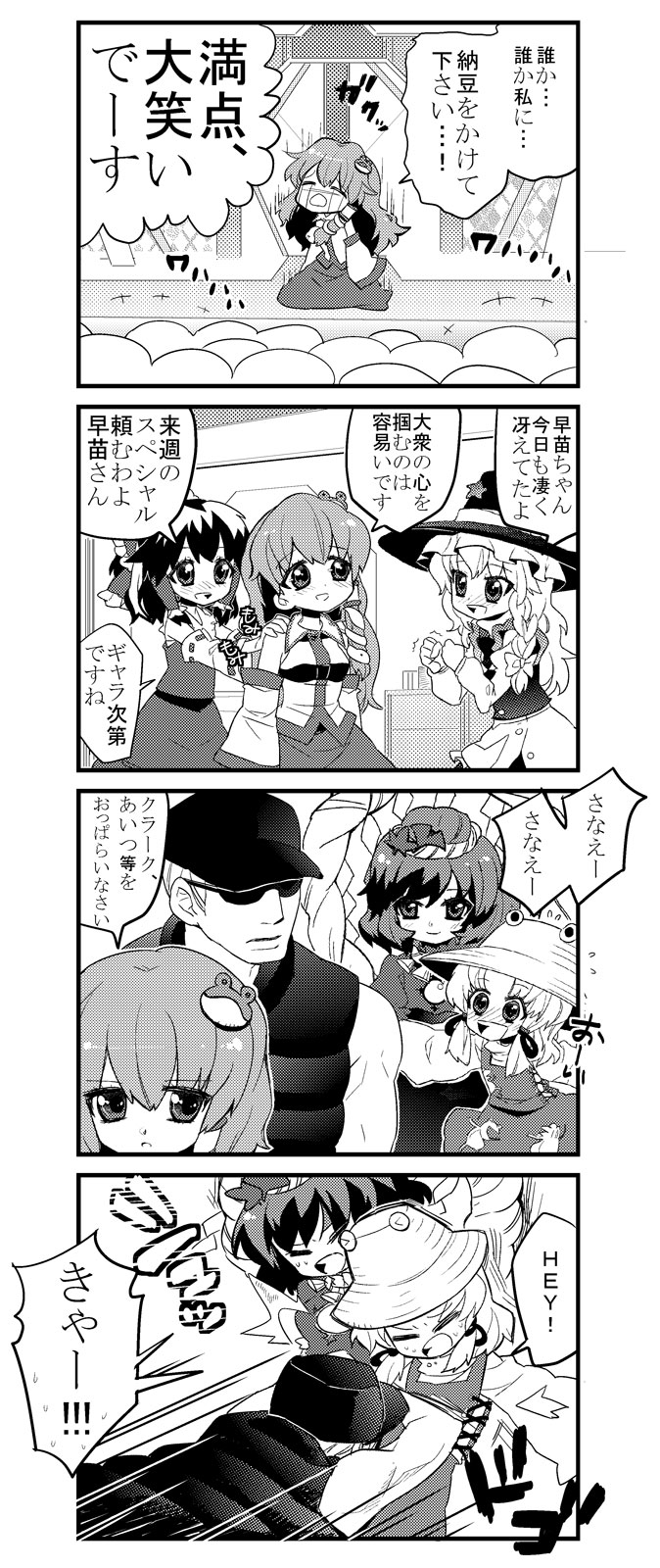 4koma6+girlsbraidcomiccrossoverdetached sleevesfemale focusfrogfrog hair ornamentgreyscalehair ornamenthairbandhatjapanese clothesmikomonochromemultiple girlsropeshort hairsleevelesssnakesnake hair ornamentsunglassestearswitchwitch hat