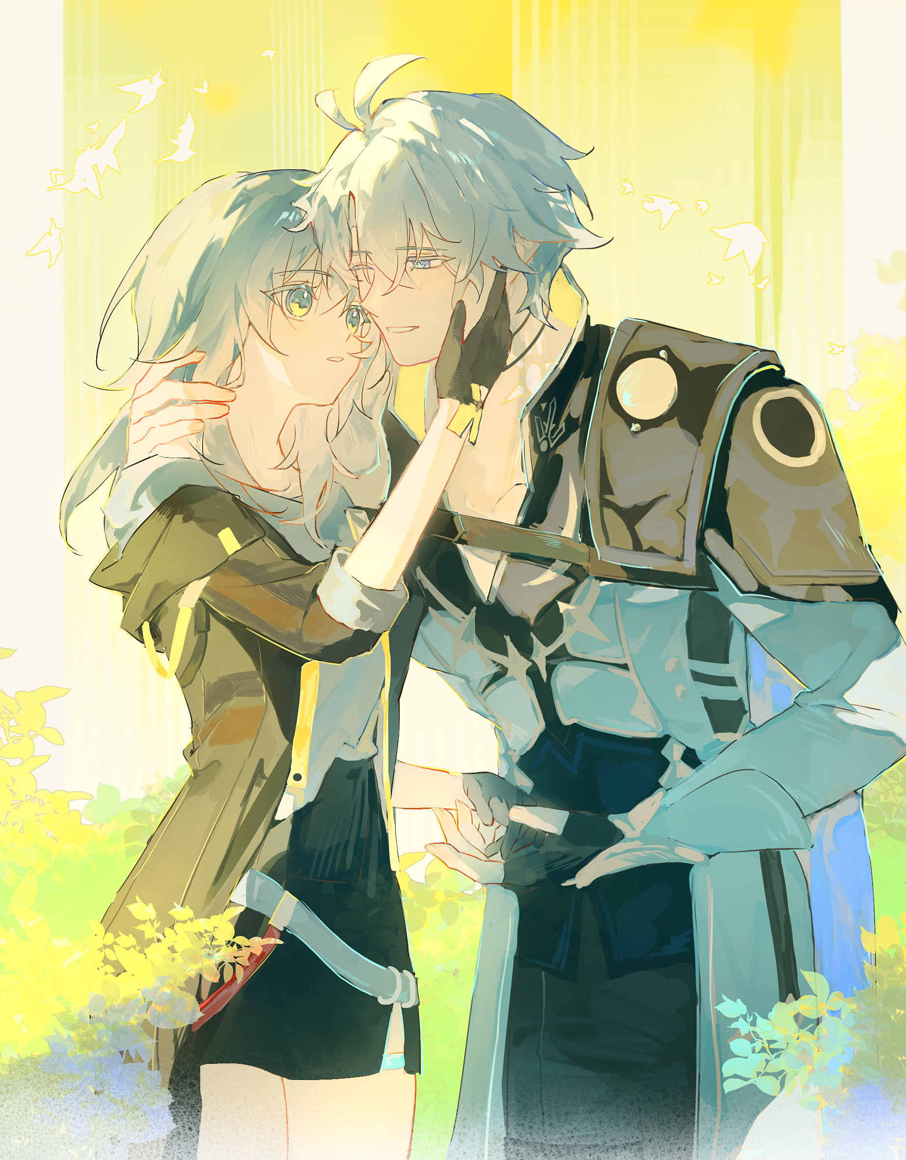 1boy1girlantenna hairarmorblack glovesblack jacketblack pantsblack skirtblue eyescoatcowboy shoteye contactfingerless glovesglovesgrey hairhair between eyeshand in another's hairhand on another's cheekhand on another's facehand upheteroimminent hand holdingjacketleaflight blushlong hairlong sleeveslooking at anotheroff shoulderoff-shoulder shirtone eye closedpantsparted lipsshirtshort hairshoulder armorside-by-sideskirtsmilestandingthigh strapthree-quarter sleevesvambraceswhite coatwhite hairwhite shirtyellow eyes