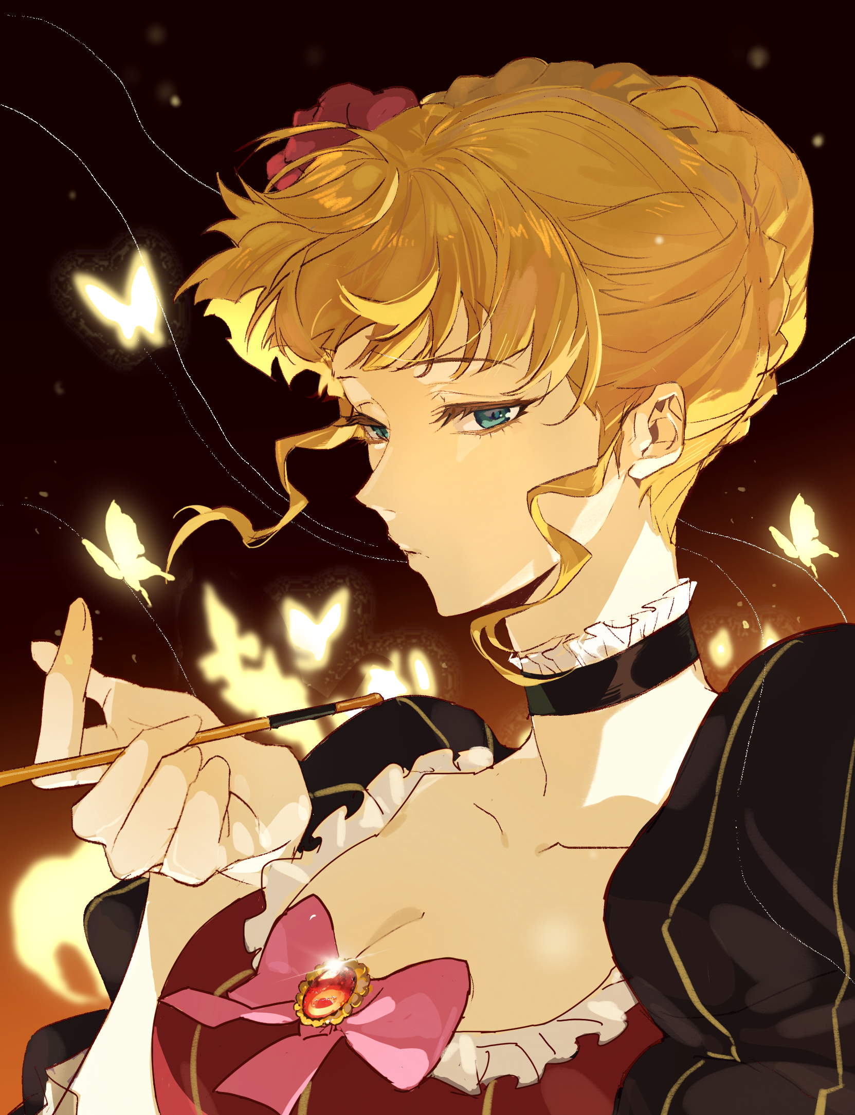 1girlblack chokerblue eyesbowbraidbreastsbugbutterflychokercleavagecrown braidfloating hairfrilled chokerfrillsgemglinthalf-closed eyesinsectlooking at viewerpink bowportraitpuffy sleevesraised eyebrowsred gemstonesidelockssolowavy hairyellow butterflyzaoyinu175
