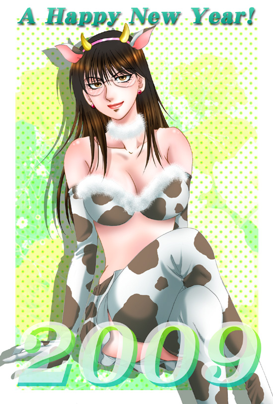 00s1girl2009animal earsanimal printbare shouldersbreastsbrown eyesbrown haircleavagecollarcow earscow girlcow hornscow printcrossed legsearringselbow glovesfemale focusglassesgloveshairbandhornsjewelrylarge breastslipslipsticklong hairlooking at viewermakeupnew yearskirtsolothighhighsyuuki setsuna (artist)