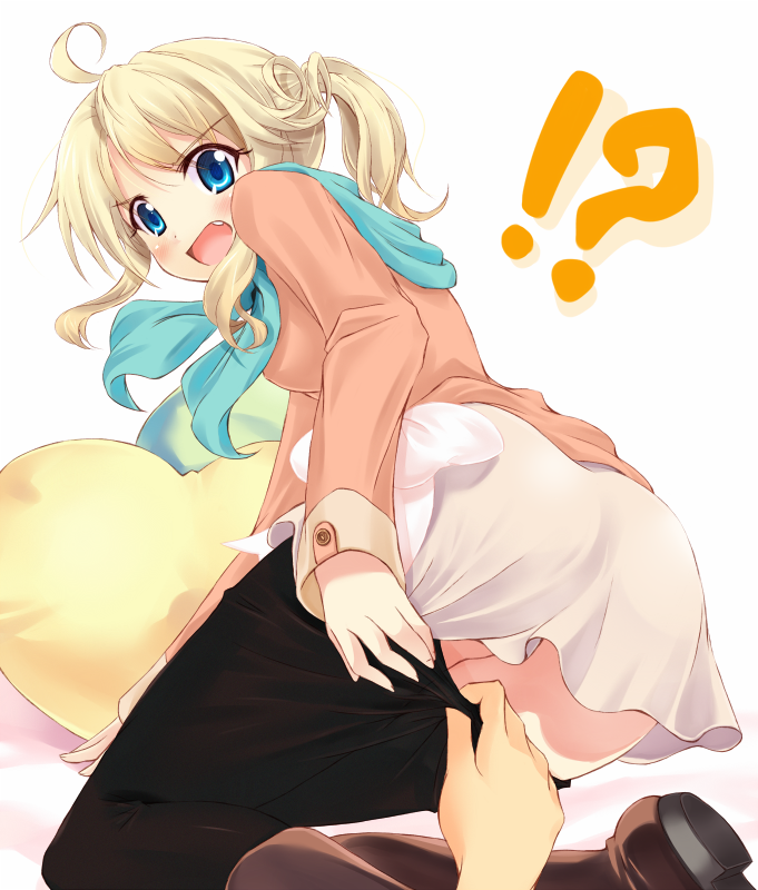 1boy1girlahogeangryassblack pantyhoseblonde hairblue eyesblushbootsclothes pullfangfemale focusfrom behindlooking backpantyhosepantyhose pullsimple backgroundskirtsolosurprised
