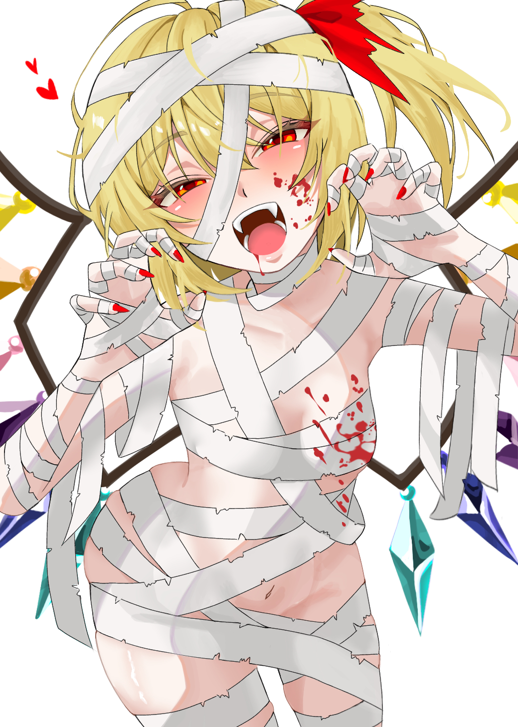 1girlbandaged armbandaged legbandagesbare shouldersblonde hairbloodblood on faceblushbreastscollarbonecowboy shotcrystalcrystal wingsfangfangshair between eyesheartlooking at viewermummy costumenail polishnavelnori 01216open mouthpaw posered eyesribbonshort hairside ponytailsimple backgroundsmall breastssolothighhighswhite backgroundwings