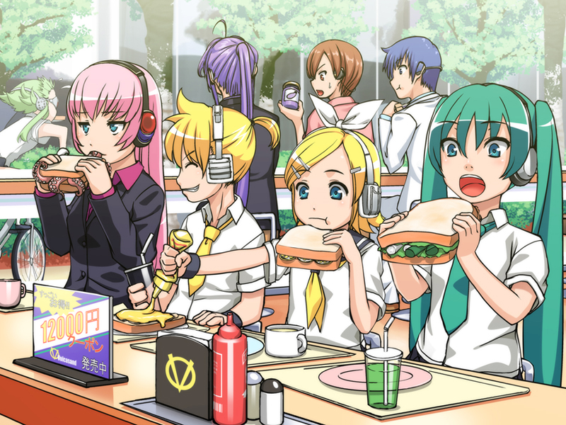 3boys5girlsaqua haireatingeggplantfoodformal clothesmayonnaisemultiple boysmultiple girlsmustardoctopussandwichschool uniformspring onionsuit