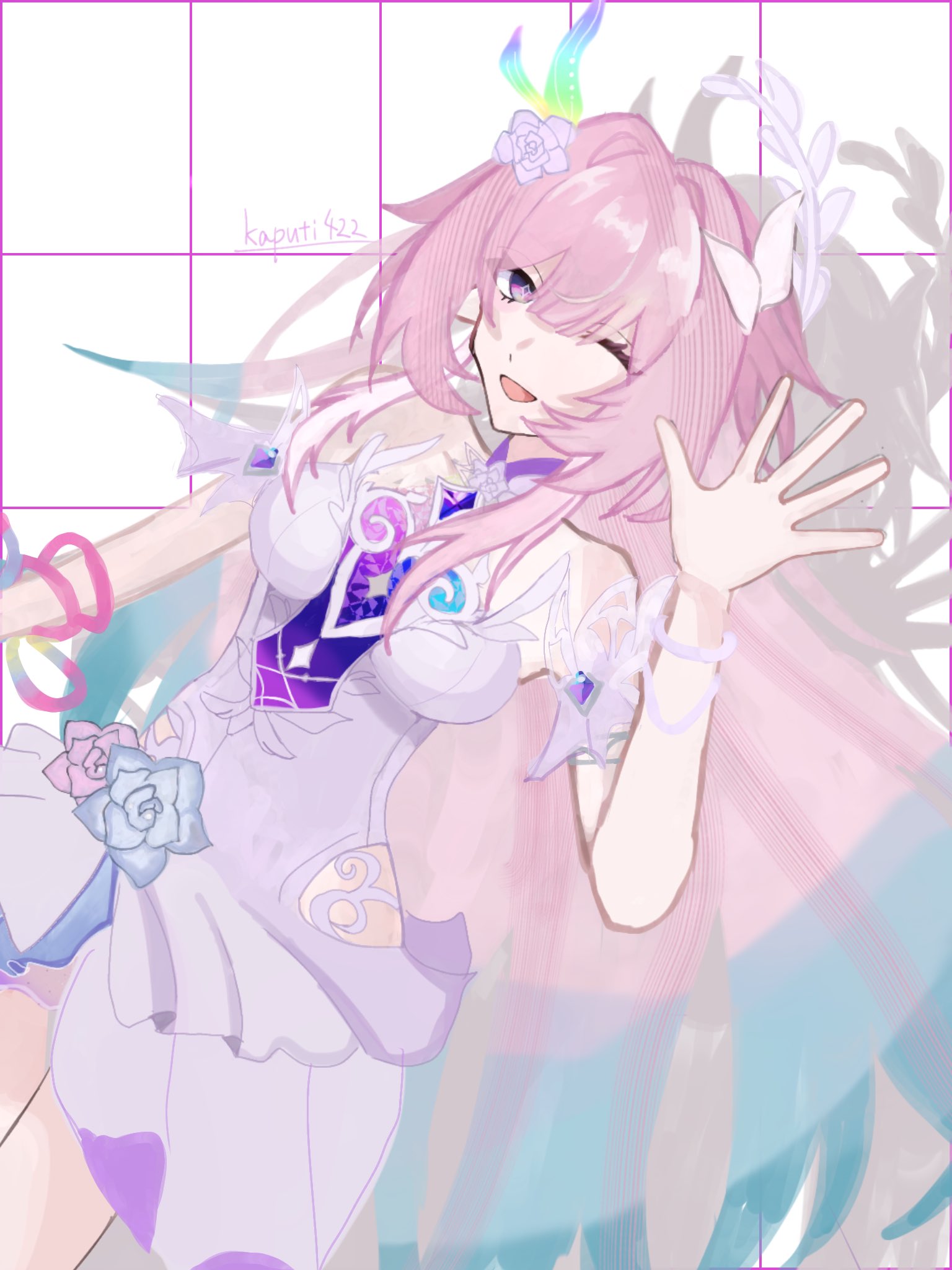 :o1girlaqua hairbare shouldersbreastsdiamond (shape)diamond-shaped pupilsdressflowergrid backgroundhair flowerhair ornamenthalokaputi422large breastslong hairlooking at viewermulticolored hairone eye closedpink hairpurple eyessolosymbol-shaped pupilstwitter usernamevery long hairwhite dresswhite hair