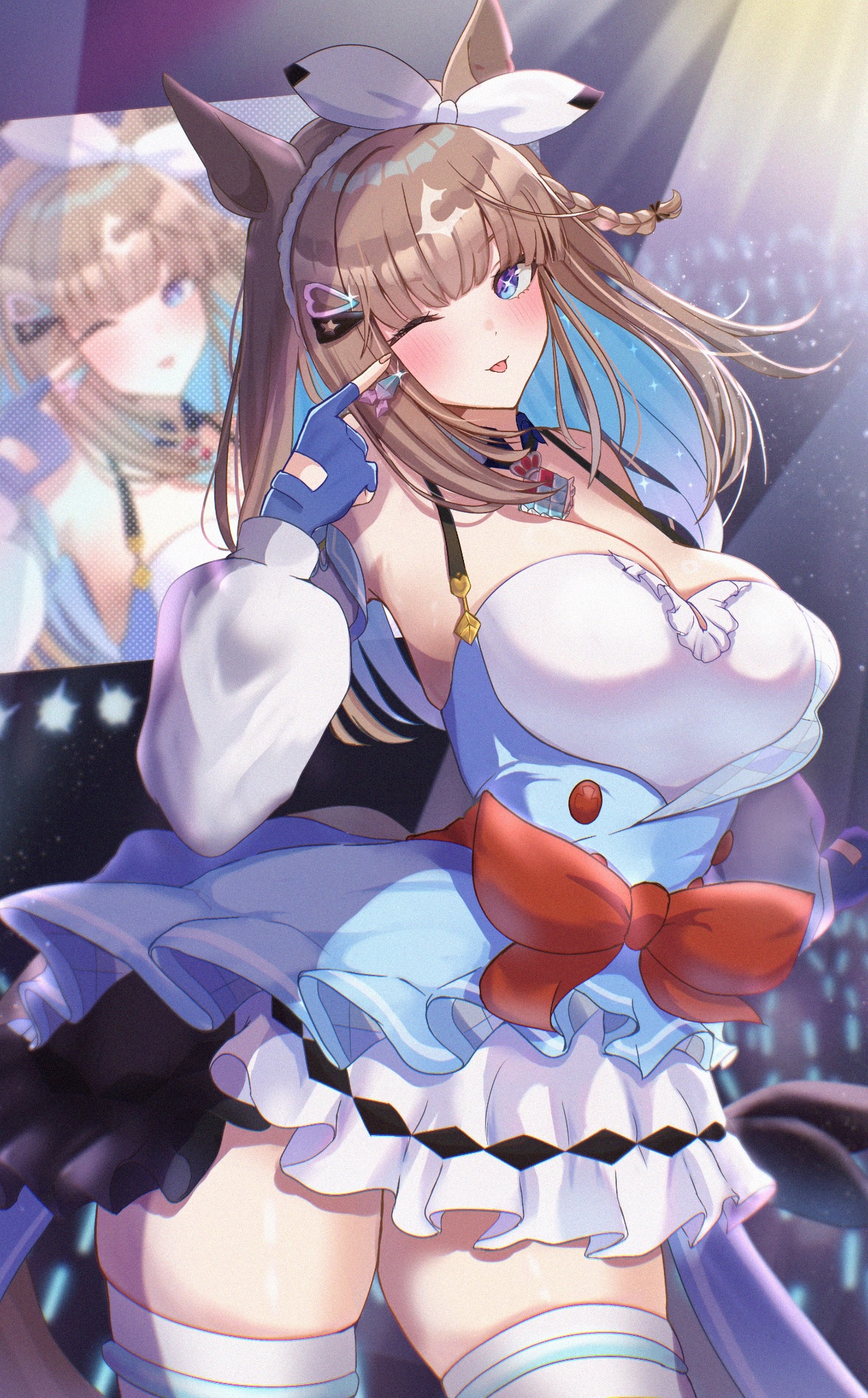 1girlanimal earsblue eyesblue glovesblue hairblushbowbow hairbandbreastsbrown haircleavagedressfingerless glovesfrilled dressfrillsgloveshairbandhorse earshorse girlhorse tailindex finger raisedlarge breastslong hairlooking at viewerpointingpointing at selfskindentationsmiletailthick thighsthighstonguetongue outtoo many hair ornamentswhite bowwhite dress