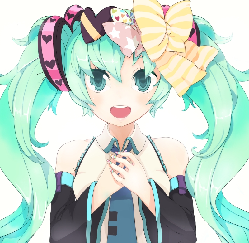 1girlaqua eyesaqua hairdetached sleevesfemale focushair ribbonheartlong hairmulticolored nailsnail artnail polishnecktieopen mouthribbonsimple backgroundsolosymbol-shaped pupilstwintails