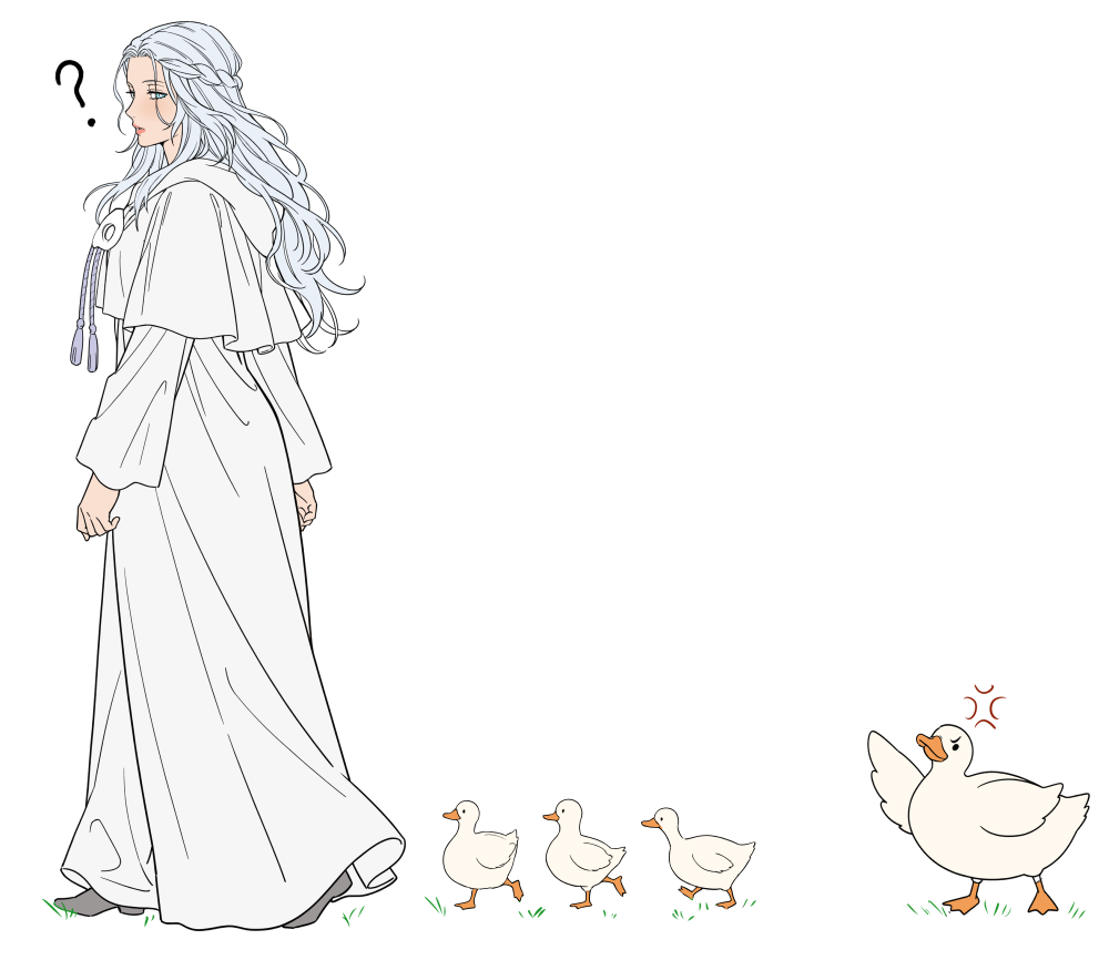 1boy1girlanger veinanimalbaby animalbirdblue eyesbraidcapeletduckducklingfollowingfrom sidehalf up braidhoodhooded capeletlong hairlooking backmaskmask around neckrobesophist's robe (ff14)spoken anger veinunworn maskwalkingwavy hairwhite hairwhite robe