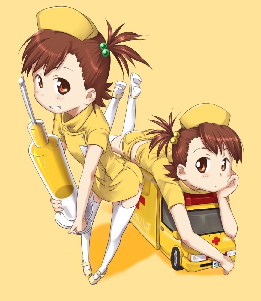 00s2girlsambulancebrown eyesbrown haircrosshair bobbleshair ornamentlarge syringelyingmultiple girlsnurseon stomachoversized objectred crosssiblingsside ponytailsisterssyringethighhighstwinsyellow theme