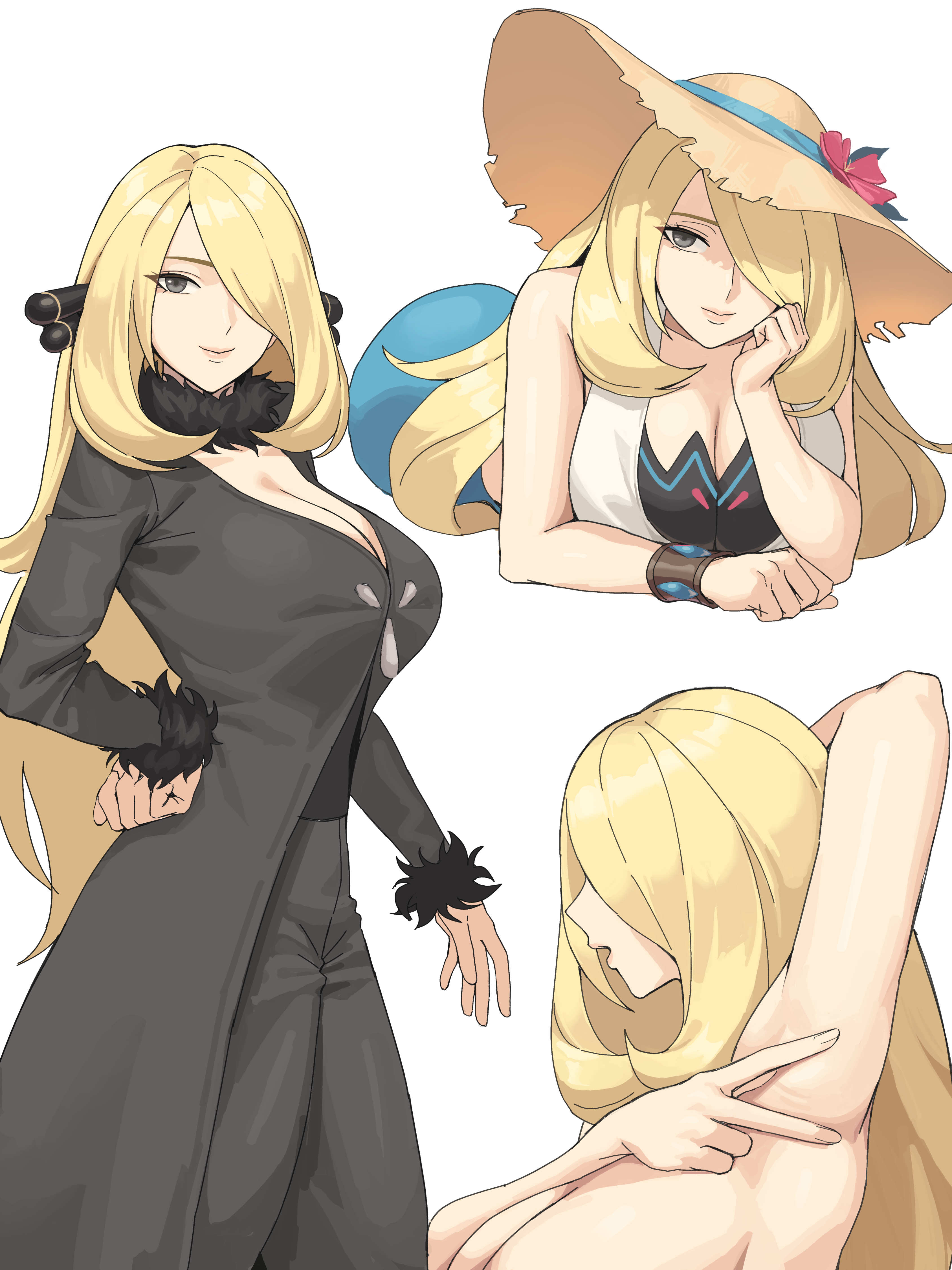 1girlarmpitsbikiniblack dressblack pantsblonde hairbreastscleavagedressfur collarfur trimfur-trimmed sleevesgrey eyeshair ornamenthair over one eyehathead restlarge breastslong hairlooking at viewerlyingnudepantssmilesolostraw hatsun hatswimsuitvvery long hairwhite bikini
