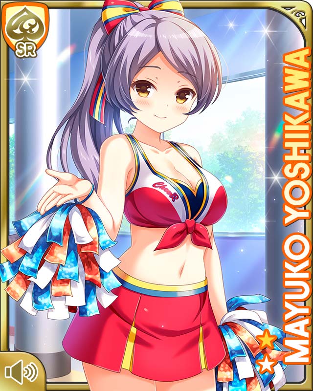 1girlbowbraburumacardcharacter namecheerleaderclosed mouthdaygrey hairhair bowindoorslong hairpom pom (cheerleading)red bowred brared burumared skirtskirtsmilesolostandingunderwearyellow eyes