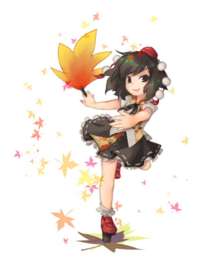 1girlblack eyesblack hairfemale focusgetahand fanhatleaflooking at vieweropen mouthshort hairskirtsmilesolotengu-getatokin hat