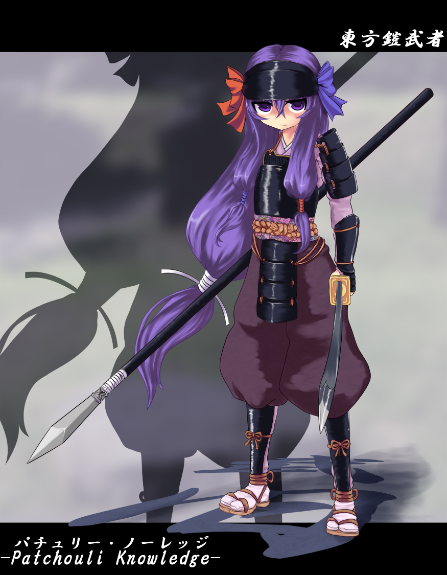 1girlarmorcharacter namefemale focuskatanalong hairlow-tied long hairpolearmpurple eyespurple hairribbonsandalssolospearswordweapon