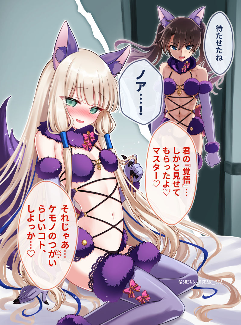 2boysanimal earsbare shouldersblack pantiesblonde hairblue eyesblushbowbrown haircosplaycrossdressingcrossdressing (mtf)elbow glovesfur collarfur trimfur-trimmed glovesfur-trimmed thighhighsglovesgreen eyeslacelace trimlace-trimmed thighhighslong hairlooking at viewermash kyrielight (dangerous beast) (cosplay)multiple boysnavelo-ringopen mouthpantiespurple glovespurple thighhighsrevealing clothessmilespeech bubbletailthighhighsthighstwintailsunderwearvery long hairwolf earswolf tail