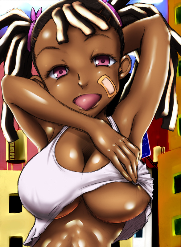 00s1girlbandaidbandaid on faceblack hairbreastsclothes liftdark skindark-skinned femalefemale focushuge breastsshirt liftsolotonguetwintailsunderboobvery dark skin