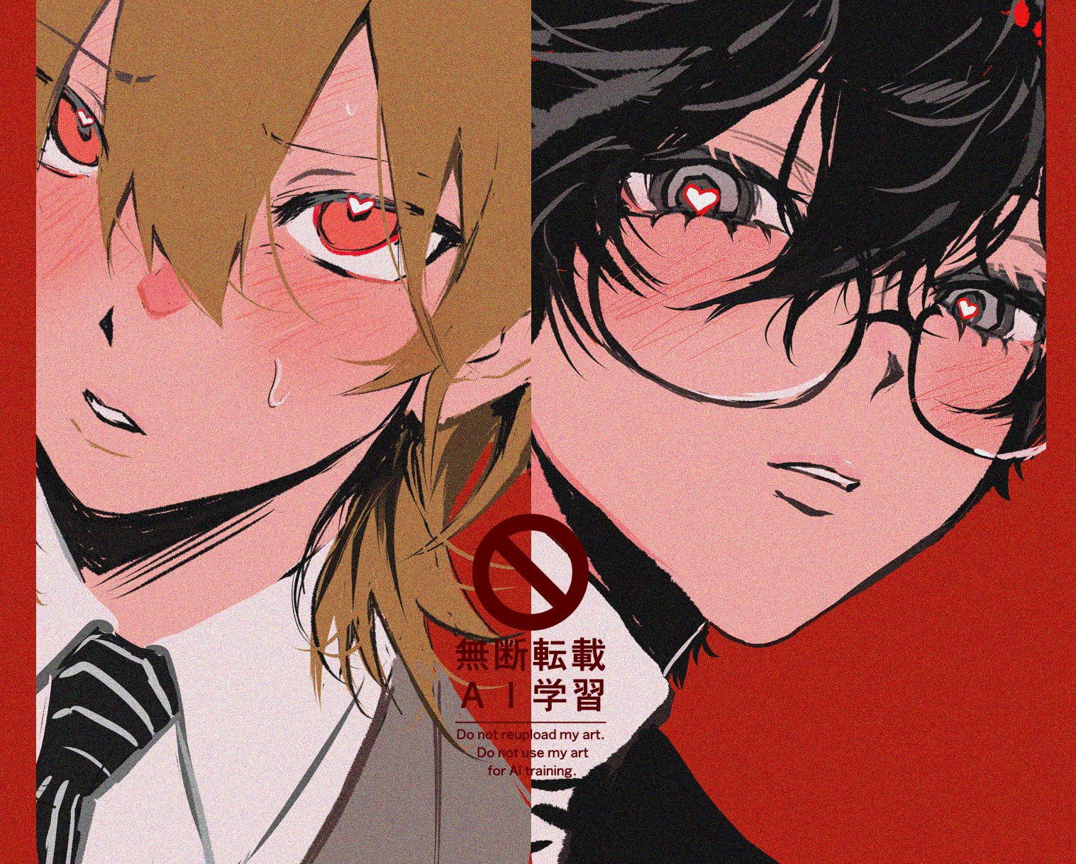 2boysblack eyesblack hairblack necktieblack-framed eyewearblushbrown hairclose-upforehead blushglasseshair between eyesheartheart-shaped pupilslooking at viewermale focusmedium hairmultiple boysnecktieparted lipsportraitred eyesshirtshort hairsimple backgroundstriped necktiesweatsymbol-shaped pupilswhite backgroundwhite shirtwing collar