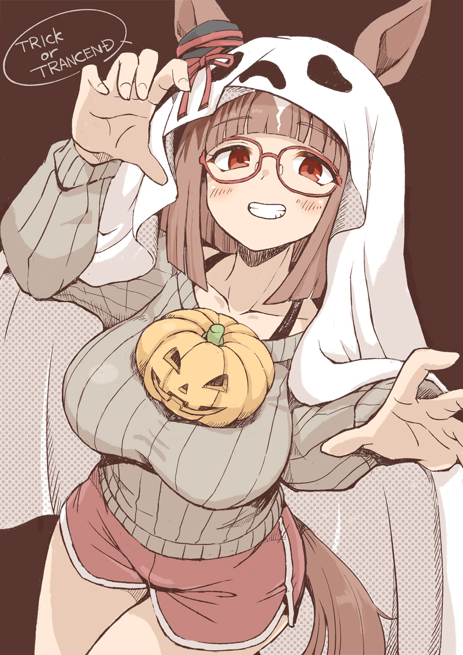 1girlalternate costumeanimal earsbowbrown hairear ornamentear ribbonglasseshalloween costumehorse earshorse girlhorse tailred eyesred-framed eyewearsmilesolotailtrick or treat