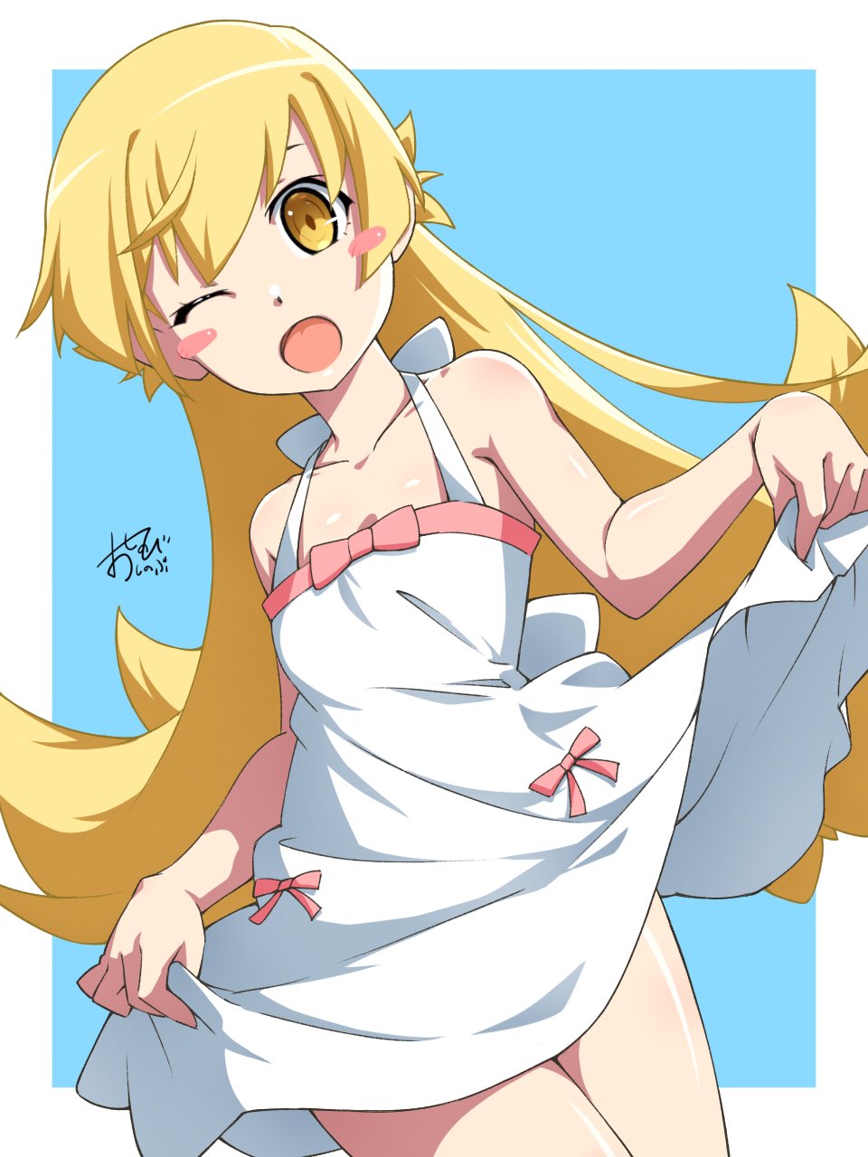 1girlapronapron liftback bowbare armsbare shouldersblonde hairblue backgroundblush stickersborderbowbow apronclothes liftcollarbonecowboy shotdot nosedutch angleflat chestflipped hairhair between eyeshair flapshalterneckhands uplegs togetherlong hairlooking at viewerone eye closedoutside borderpointy earsred bowringed eyesshoulder blushsidelockssignatureslit pupilssmilesolovery long hairw armswaist bowwhite apronwhite borderwhite bowyellow eyes