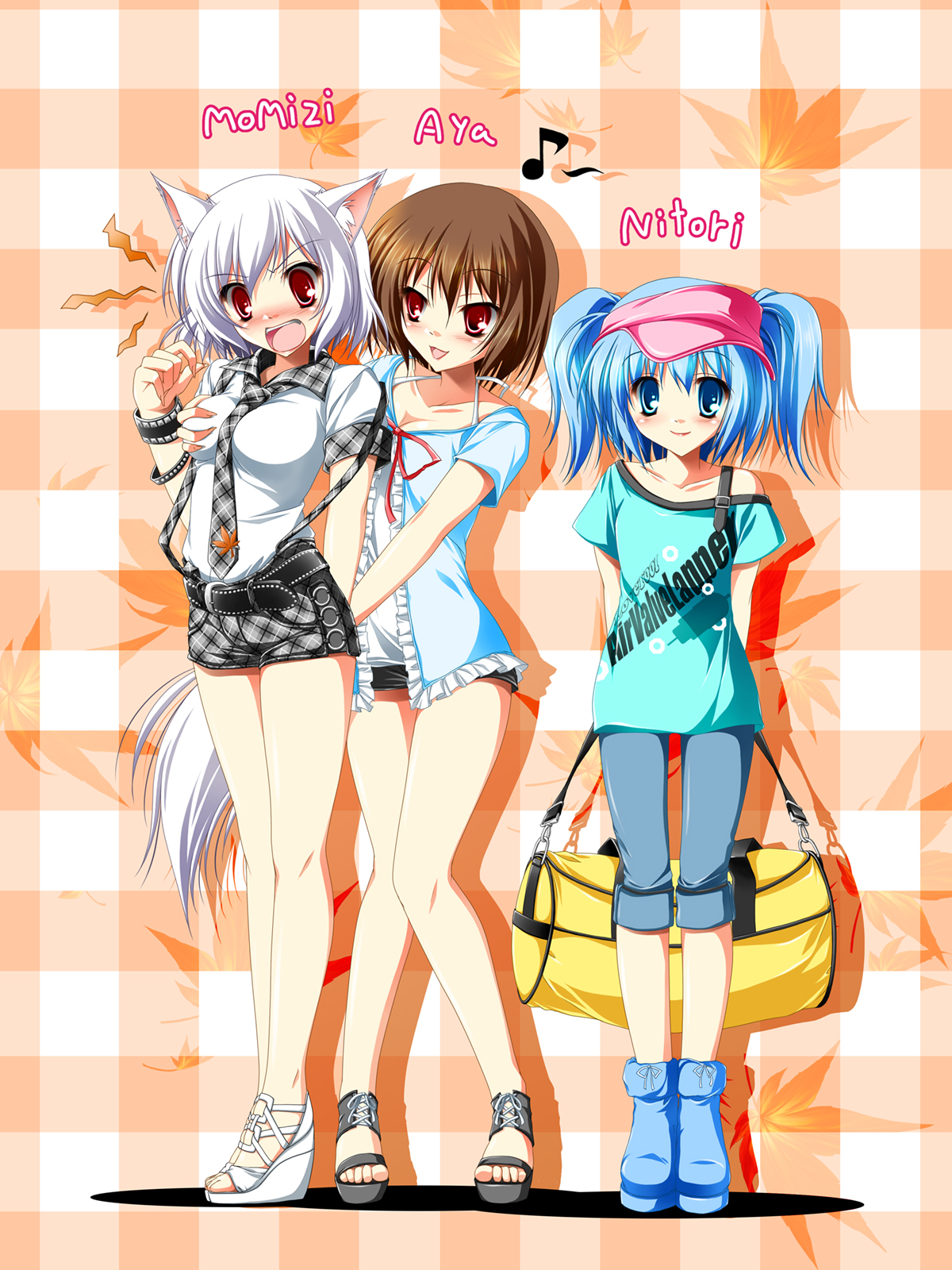3girlsalternate costumeanimal earsbeltblack hairblue eyesblue hairblushbreastscasualcontemporaryfemale focusgrabbing another's breastgropinghigh heelslarge breastslegsmedium breastsmultiple girlsmusical notenecktiered eyessandalsshoesshort hairshort shortsshortstailtwintailstwo side upwedge heelswhite hairwolf earswolf tail