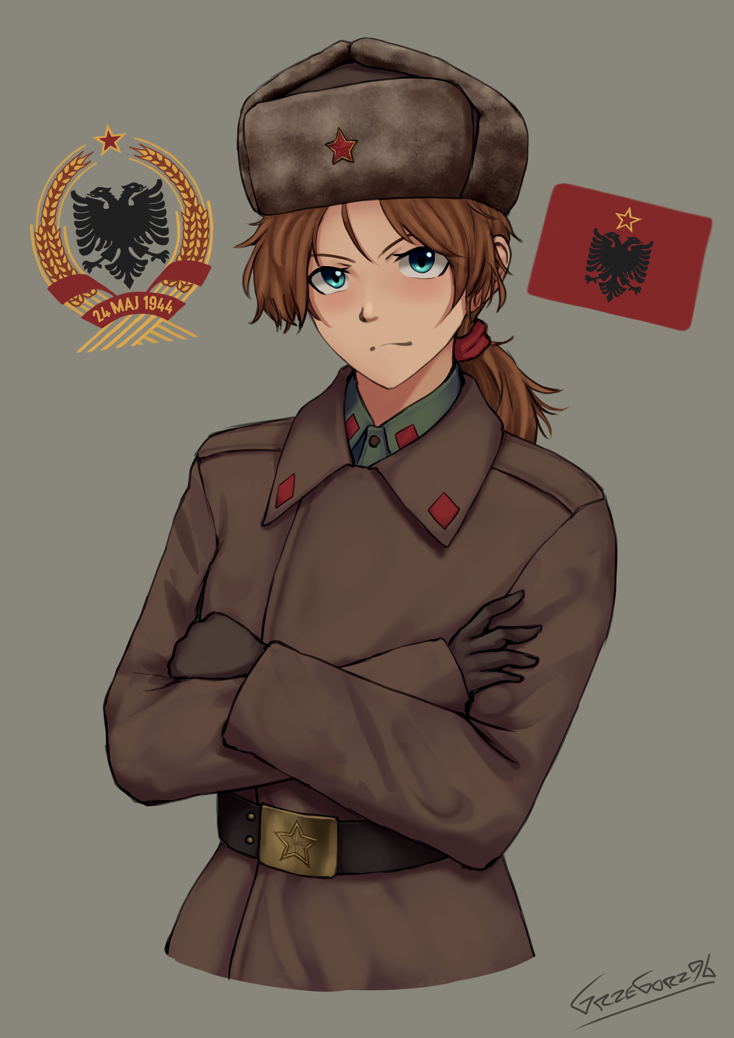 1girlalbaniaalbanian armyalbanian flagaqua eyesartist namebeltblack beltblushbrown coatbrown glovesbrown hairbrown hatcoatcollar tabscollared shirtcrossed armsemblemfrownglovesgreen shirtgrey backgroundhatlooking at viewermilitarymilitary uniformponytailred collar tabsred starshirtsimple backgroundstar (symbol)upper bodyushanka