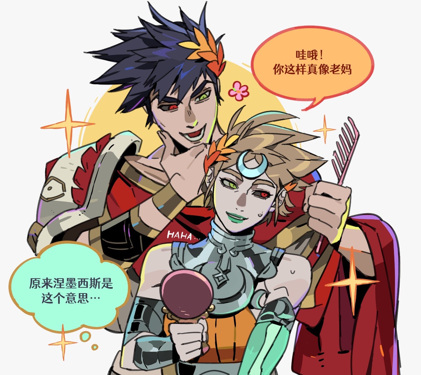 1girlancient greek clothesasymmetrical armsblack sclerablonde hairchinese textcolored scleradressenglish textglowing armgreco-roman clothesgreen eyesgreen lipsheterochromialaurel crownmismatched scleramixed-language textorange dressred eyessee-through bodyshort hairsiblingsskeletal armsmile
