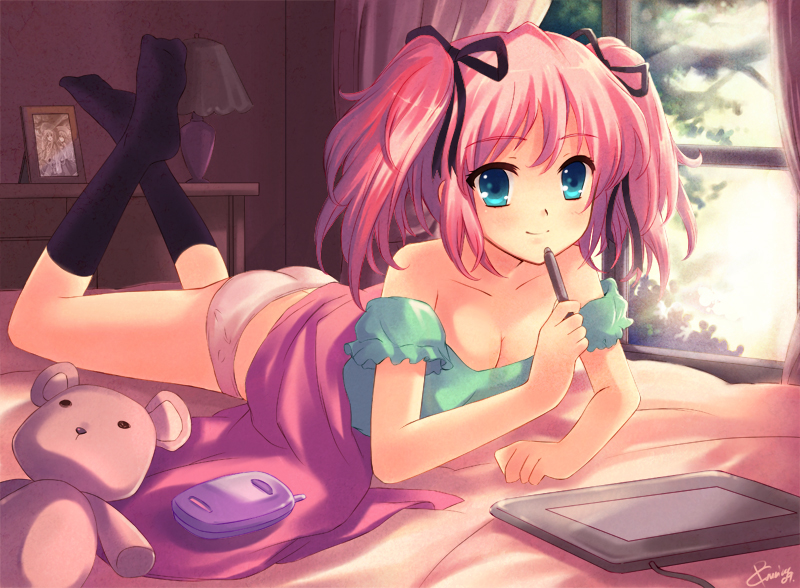 1girlbedblue eyesbottomlessbreastscellphonecleavagedrawing tabletfemale focusfull bodyhair ribbonindoorslooking at viewerlyingmedium breastsno pantsno shoeson stomachpantiespenphonepink hairribbonsmilesolostuffed animalstuffed toystylusteddy beartwintailsunderwearwindow