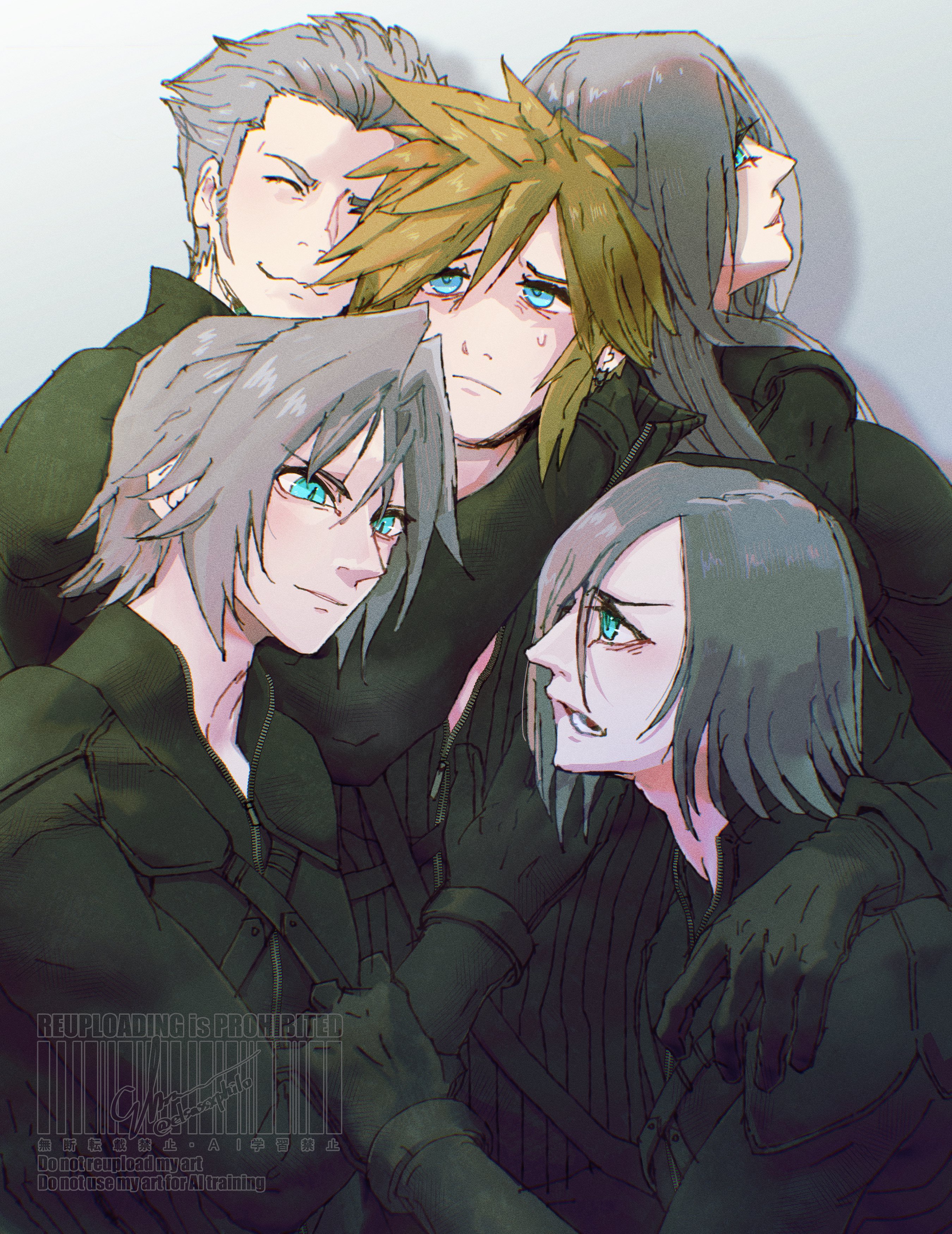 5boysarm around neckblack glovesblack jacketblonde hairblue eyesclosed eyesearringseyelashesglovesgrey hairhappyholdinghugjacketjewelrylong hairmale focusmultiple boysopen mouthpossessivesephiroth (remnant suit)short hairsingle earringslit pupilsspiked hairsweatdropyaoi