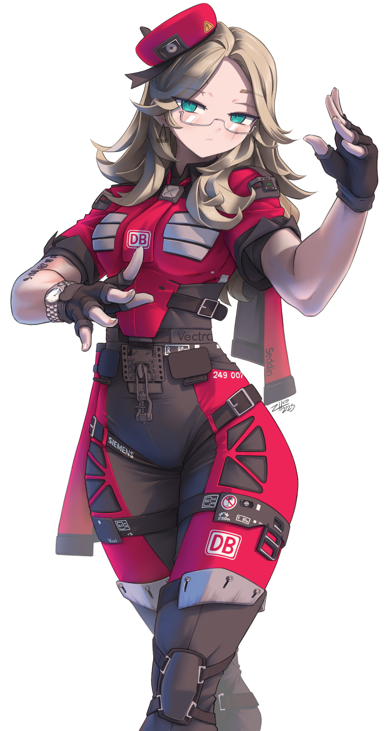1girlartist namebelt buckleberetblack glovesblonde hairbucklecowboy shotdatedexpressionlessglovesgreen eyeshand uphathigh voltage symbolknee padslong hairpantographpersonificationred hatsemi-rimless eyewearsiemenssignaturesimple backgroundsolostandingtext printthighsunder-rim eyewearwatchwhite backgroundwristwatch