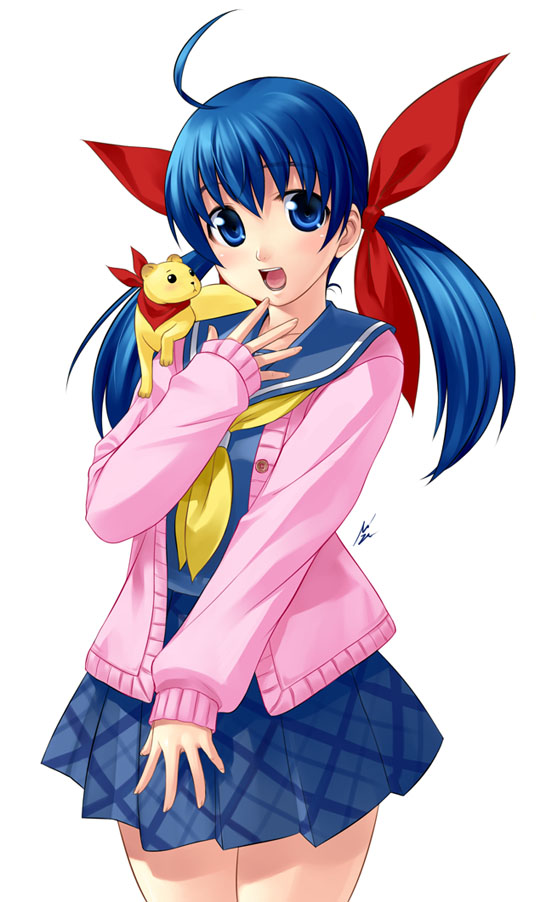 1girlahogealternate costumeblue eyesblue hairbowcardiganfemale focusferrethair bowhair ribbonlong hairlooking at viewermascotmatching hair/eyesopen mouthpink sweaterribbonschool uniformserafukusignatureskirtsmilesolosweatertwintails