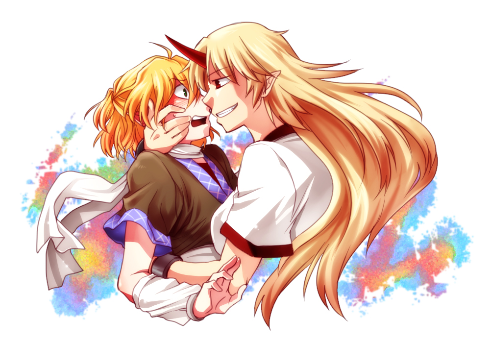 2girlsarm warmersblonde hairblushfemale focusgreen eyeshalf updohornslong hairmultiple girlspointy earsred eyesscarfshort hairsingle horn