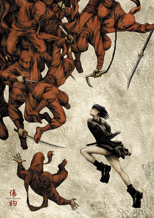 1girl6+boysbattlebootschainfighting stancekama (weapon)katanaknifekusarigamalegsmultiple boysnaginataninjapolearmready to drawreverse gripsai (weapon)school uniformsickleskirtswordweapon