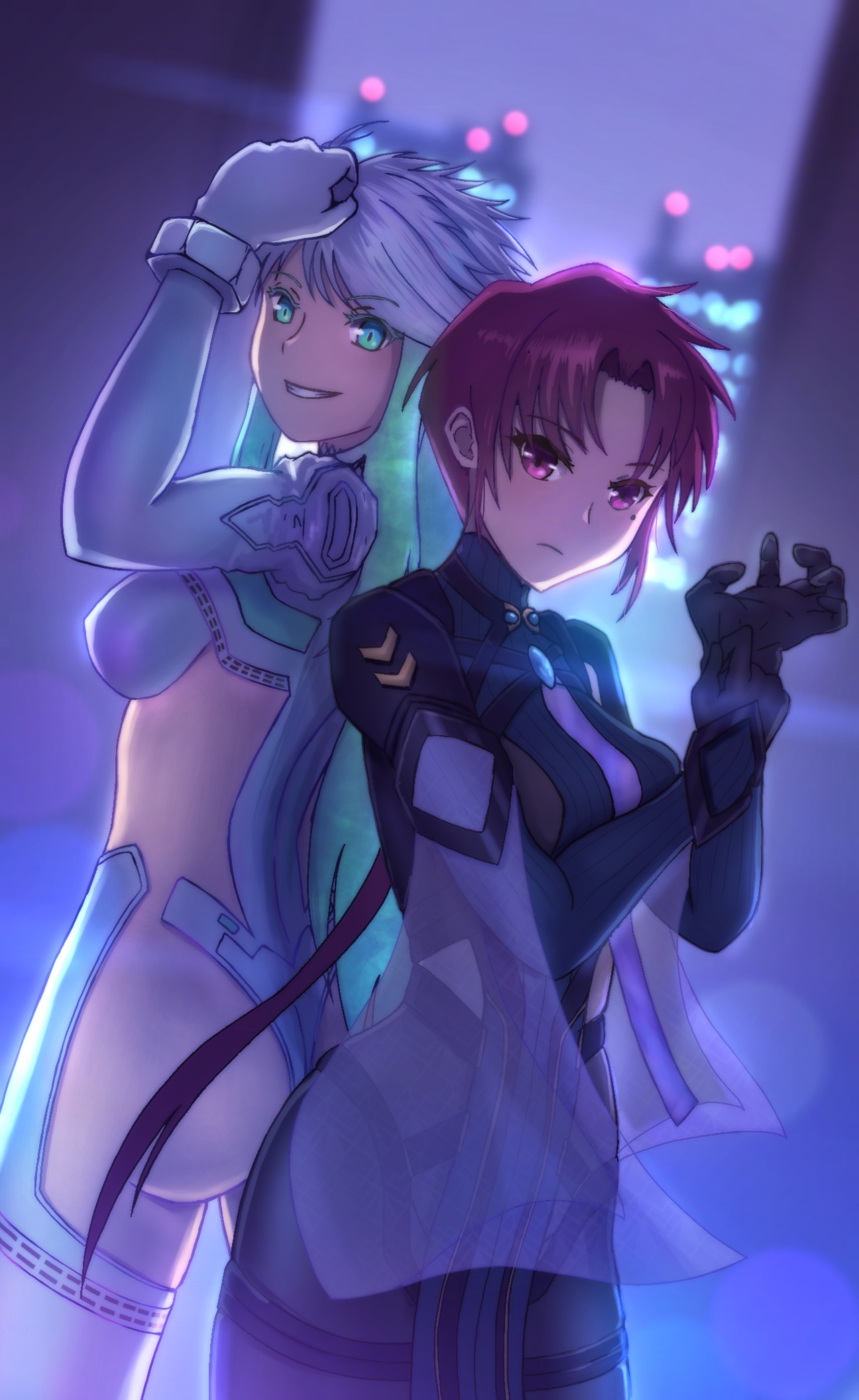 2girlsarmpit cutoutblack bodysuitblue bodysuitbodysuitbreastsclothing cutoutcolored inner haircrystal hairglovesgreen eyesgreen hairimpossible bodysuitimpossible clothesimpossible leotardjuliet sleeveslarge breastsleotardlong hairlong sleeveslooking at viewerlow ponytailmolemole under eyemulticolored bodysuitmulticolored hairmultiple girlsparted bangspelvic curtainponytailpuffy sleevesred eyesred hairribbed bodysuitsideless leotardsideless outfitskin tightsmilethighstwo-tone bodysuitwhite hairwhite leotard