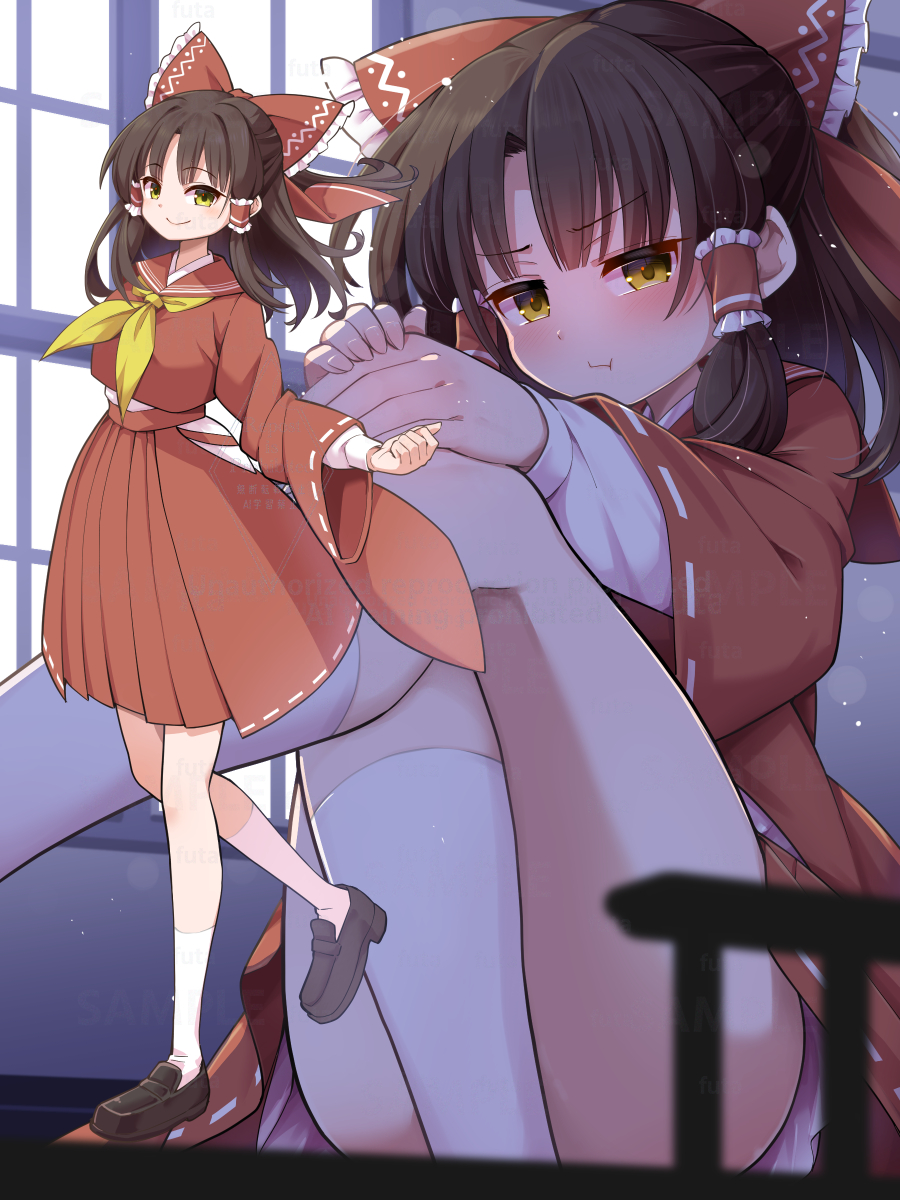 1girlalternate costumeblushbowbrown eyesbrown hairbrown shoesclosed mouthfrilled bowfrilled hair tubesfrillshair bowhair tubeskneehighsloaferslong hairlooking at viewermultiple viewsneckerchiefpoutred bowred sailor collarred shirtred skirtribbon trimribbon-trimmed sleevessailor collarschool uniformshirtshoesskirtsmilesockswatermarkwhite socksyellow neckerchief