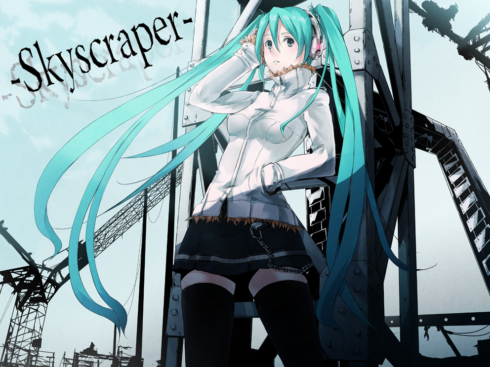 1girlblue hairblushbuildingcasualfemale focushand in pocketheadphoneslong hairskirtskyscrapersolosong namethighhighstwintailsvery long hairzettai ryouiki