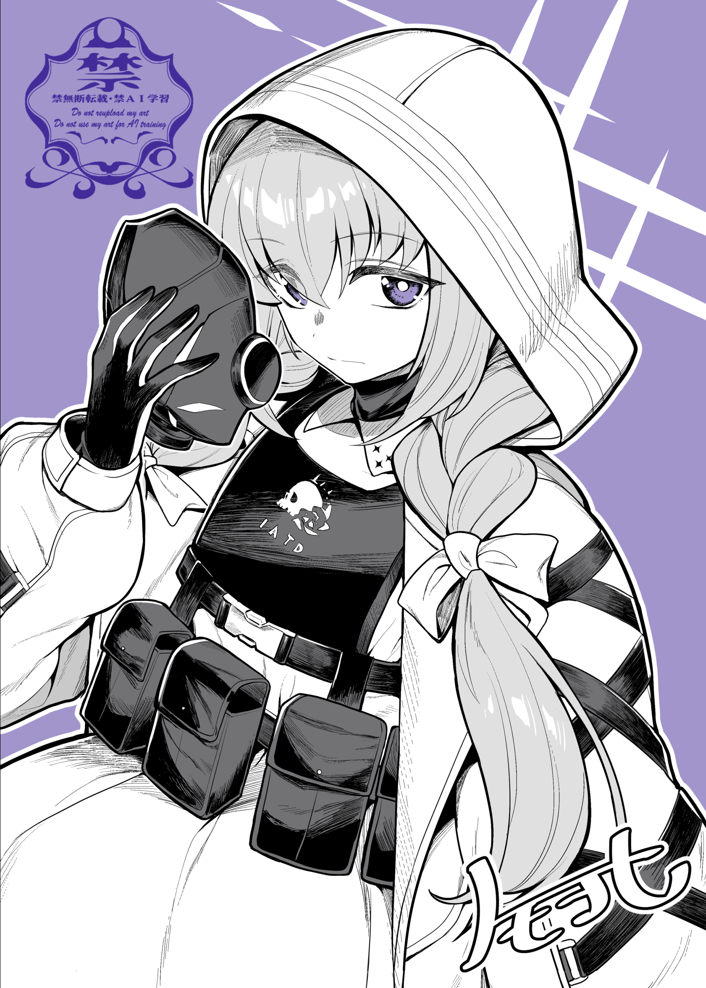 1girlbowclosed mouthcoatcowboy shotglovesgreyscale with colored backgroundhair between eyeshair bowhaloholdingholding maskhoodhood uphooded coatlong bangslong hairlooking at viewermaskpouchpurple backgroundpurple eyessolospot colorunworn mask