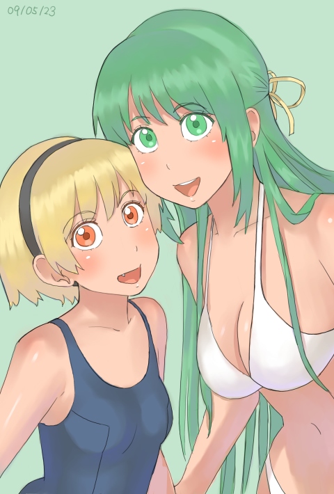 00s20092girlsbikiniblonde hairblushbreastscleavagedatedfanggreen backgroundgreen eyesgreen hairhairbandhalf updohappylong hairmedium breastsmultiple girlsone-piece swimsuitorange eyesschool swimsuitshort hairsmall breastsswimsuit