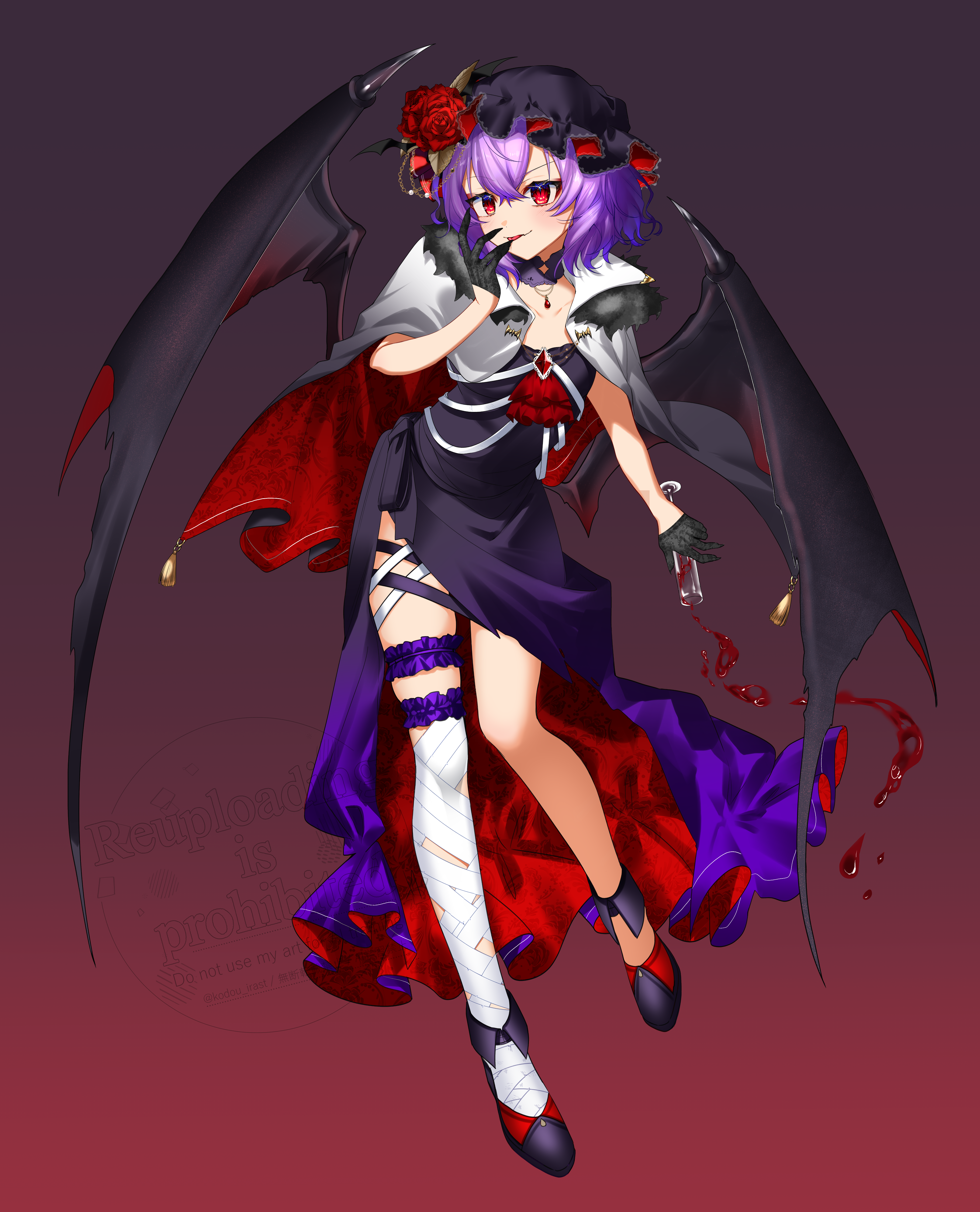 1girlalternate costumealternate headwear colorbandaged legbandagesblack capeblack dressblack glovesblack hatbloodcapecupdressflowerfrilled thigh strapfull bodyglovesgradient backgroundgradient capegradient clothesgradient dresshalf gloveshalloweenhalloween costumehathat flowerhigh-low dressholdingholding cuplooking at viewerpurple dresspurple shoesred capered flowerred roseroseshoessmilesolotasselthigh straptwo-sided capetwo-sided fabricwatermarkwhite cape