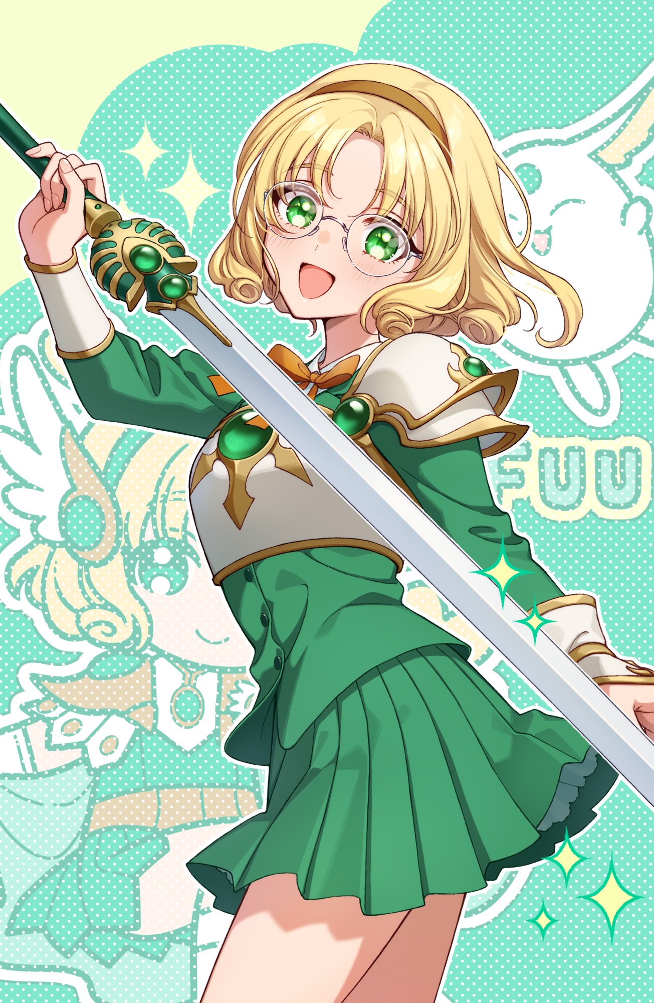 1girlarmorblonde hairbowbowtiebrown bowbrown bowtiebrown hairbandcharacter namecowboy shotfrom sideglassesgreen eyesgreen shirtgreen skirthairbandholdingholding swordholding weaponlong sleeveslooking at viewerlooking to the sideopen mouthpauldronspleated skirtround eyewearshirtshoulder armorsingle pauldronskirtsoloswordweapon
