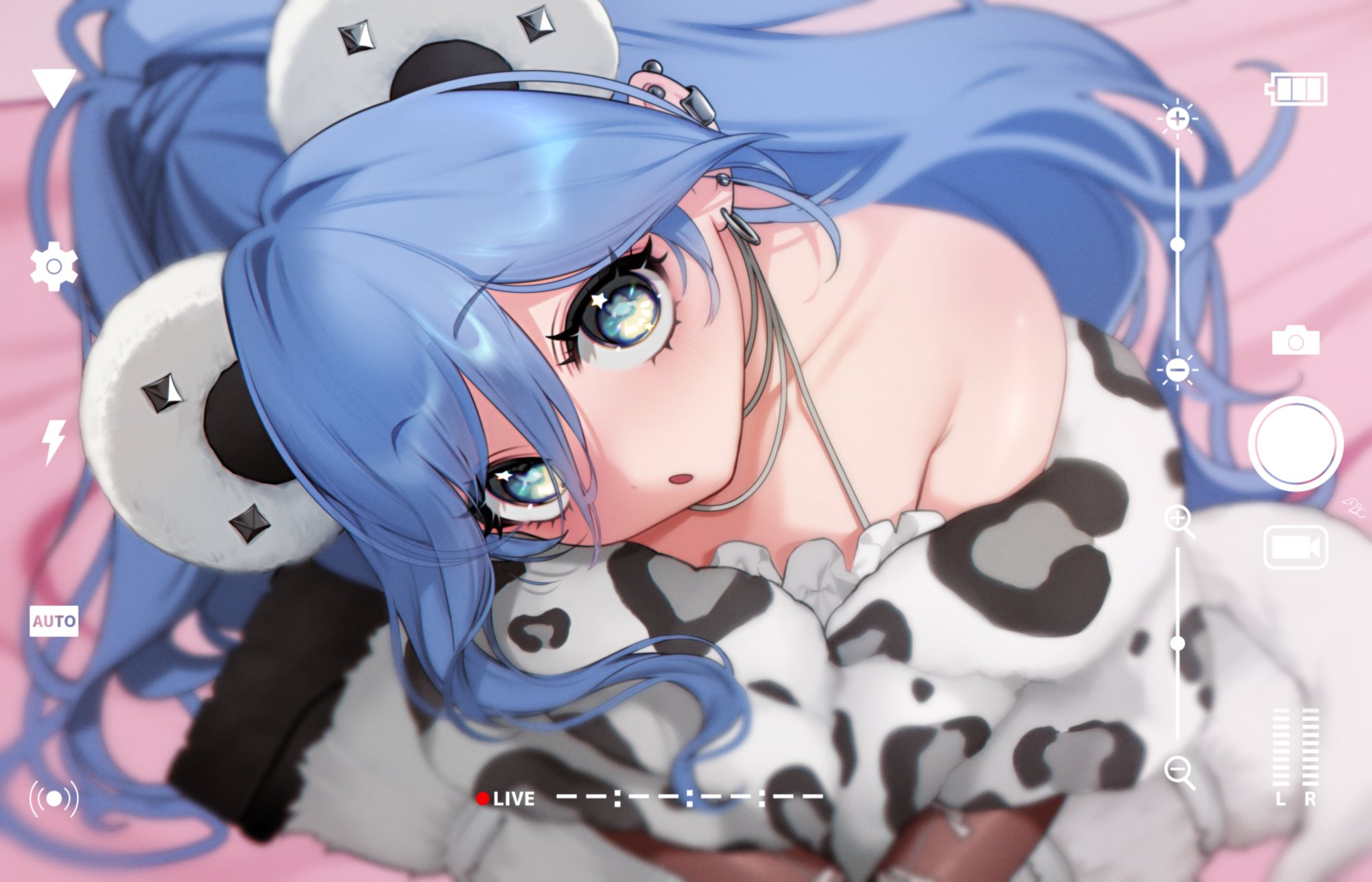 1girlanimal ear headwearanimal earsanimal printaqua eyesbare shouldersbear earsblue hairblurrycollarbonedepth of fieldear piercingfake animal earshair between eyeshead tiltjacketlong hairlooking at viewerofficial alternate costumepiercingsolotiger printvirtual youtuberwhite jacket