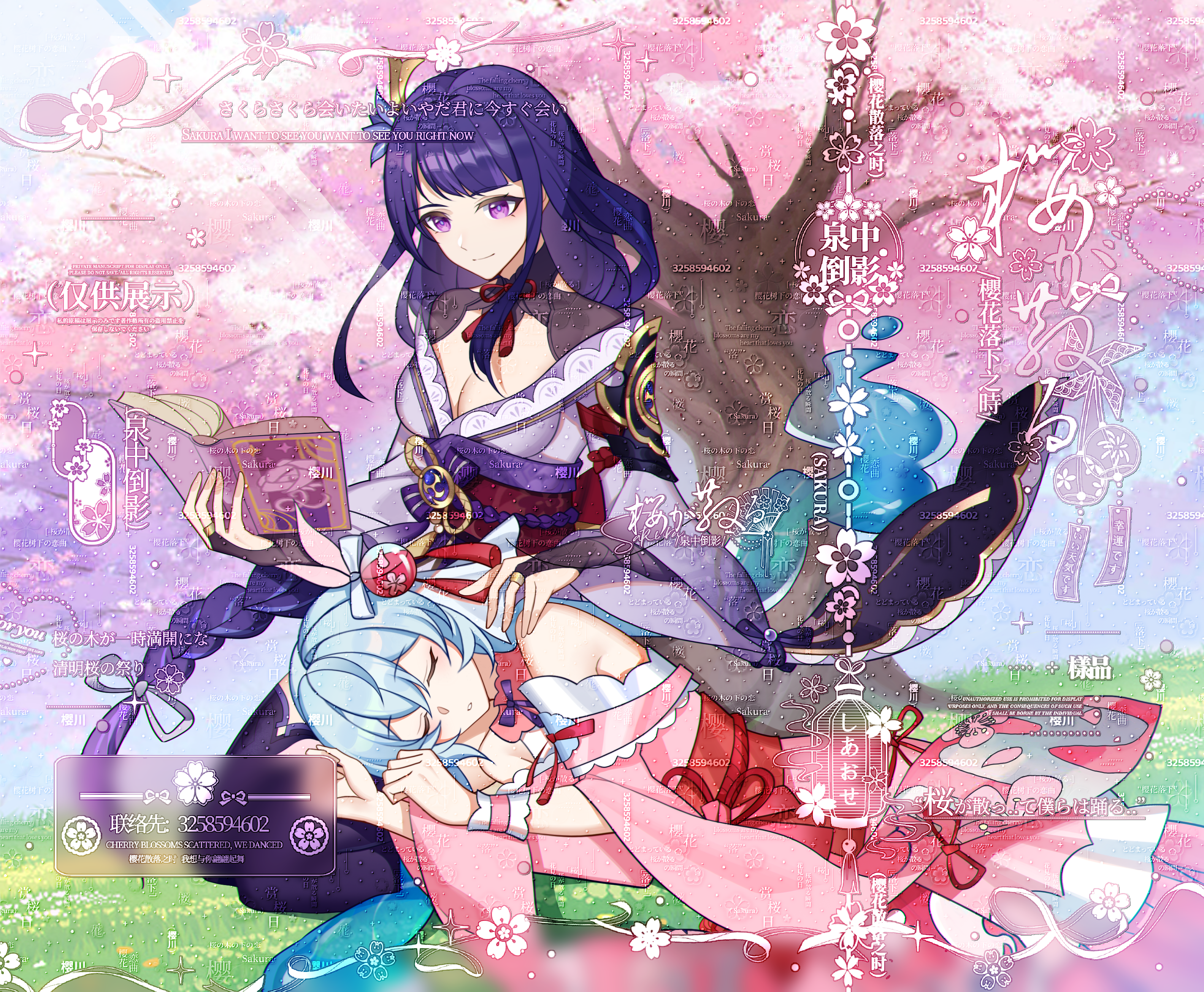 2girlsarmorbare shouldersblue hairblue pupilsblue skyblunt bangsblurryblurry backgroundbraidbreastsbridal gauntletscherry blossomscleavageclosed mouthcoupledaygradient hairgrasshair between eyeshair ornamenthair ribbonjapanese clotheskimonolight blushlight smilelong braidlong hairlooking downlying on personmulticolored eyesmulticolored hairmultiple girlsno moleoff shoulderon grassoutdoorspink kimonopurple eyespurple hairpurple kimonopurple ribbonred sashribbonsashseizashoulder armorsingle braidsittingskysleepingstreaked hairsunlighttreewatermarkwide sleeveswrist cuffsxinjinjumin936787422802yuri