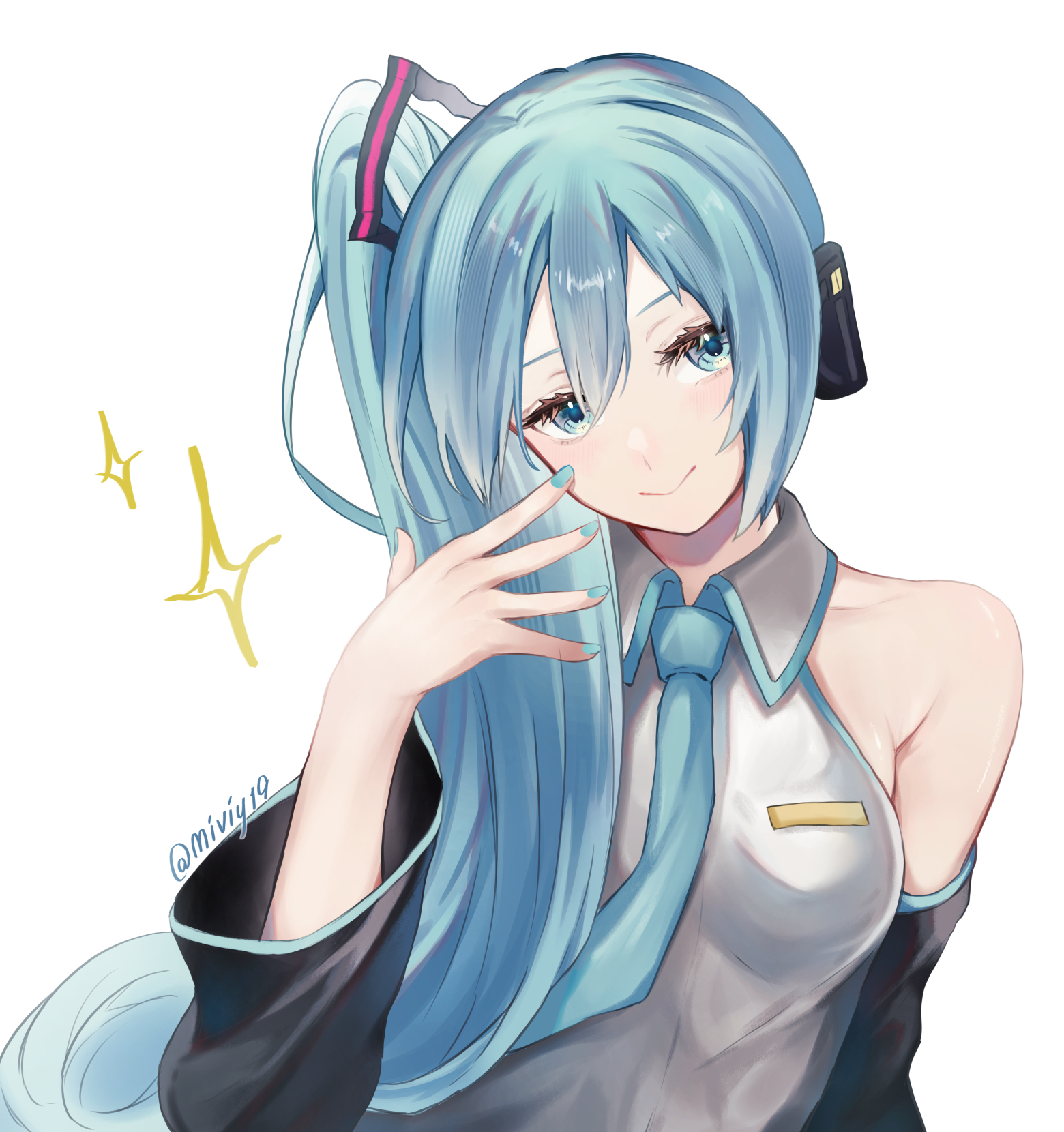 1girlalternate hairstyleaqua eyesaqua hairaqua nailsaqua necktieaqua trimbare shouldersblack sleevesblushbreastsclosed mouthcollarbonecollared shirtdetached sleevesgrey shirthair between eyeshair ornamenthair over shoulderhand uphead tiltheadphoneslong hairlong sleeveslooking at viewermedium breastsmemenecktieshirtside ponytailsidetail miku noodle stopper (meme)simple backgroundsleevelesssleeveless shirtsmilesolotwitter usernameupper bodyvery long hairwhite backgroundwide sleeves