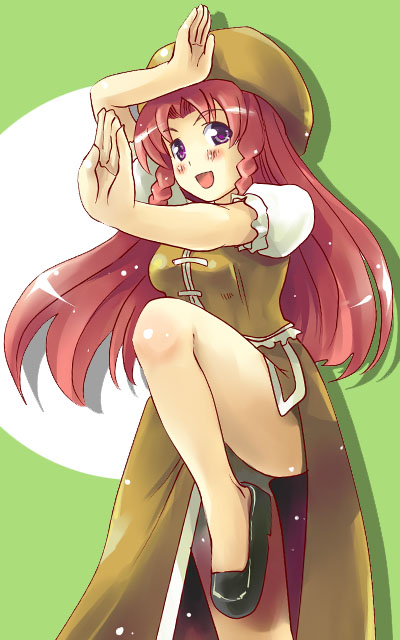 1girlbraidchina dresschinese clothesdressfemale focushatlong hairpurple eyesred hairsolotwin braids