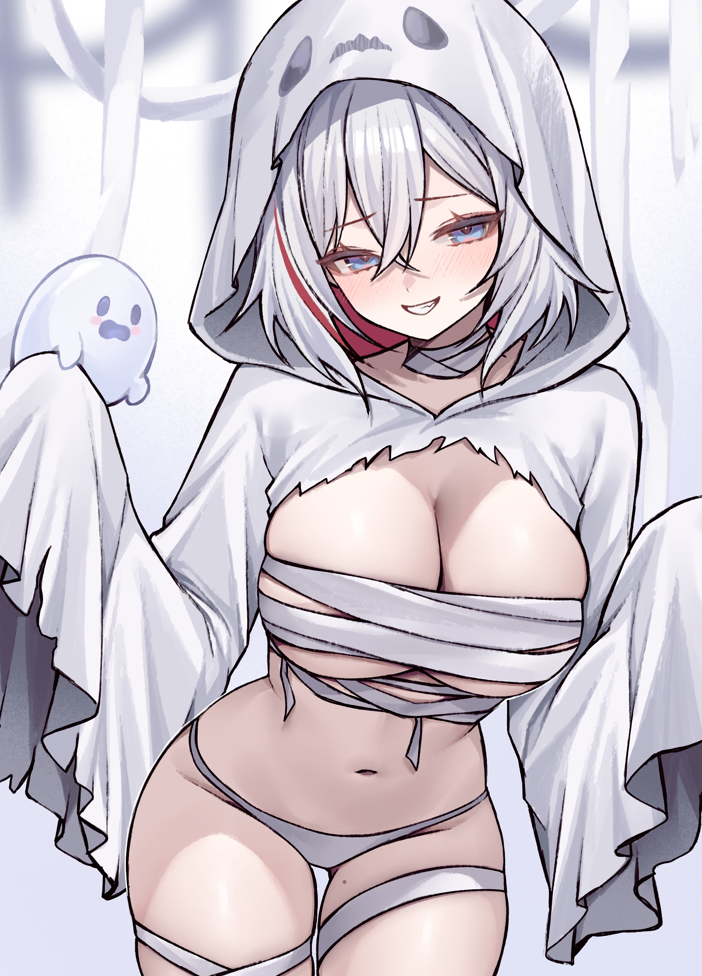 1girlbandaged chestbikinibikini bottom onlyblue eyesbowbreastsghost costumehalloweenhappy halloweenlarge breastsmidriffmulticolored hairnavelred bowsolostreaked hairswimsuitthighstwo-tone hairwhite bikiniwhite hair
