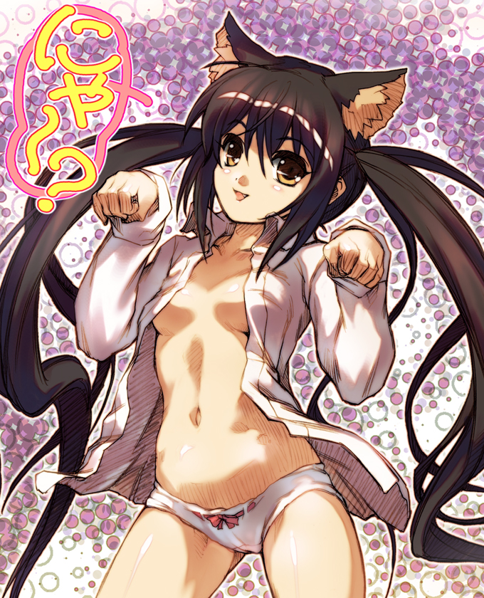 00s1girlanimal earsbreastscat earscat girlfemale focuslong hairno pantsopen clothesopen shirtpantiespaw poseshirtsolotwintailsunderwear