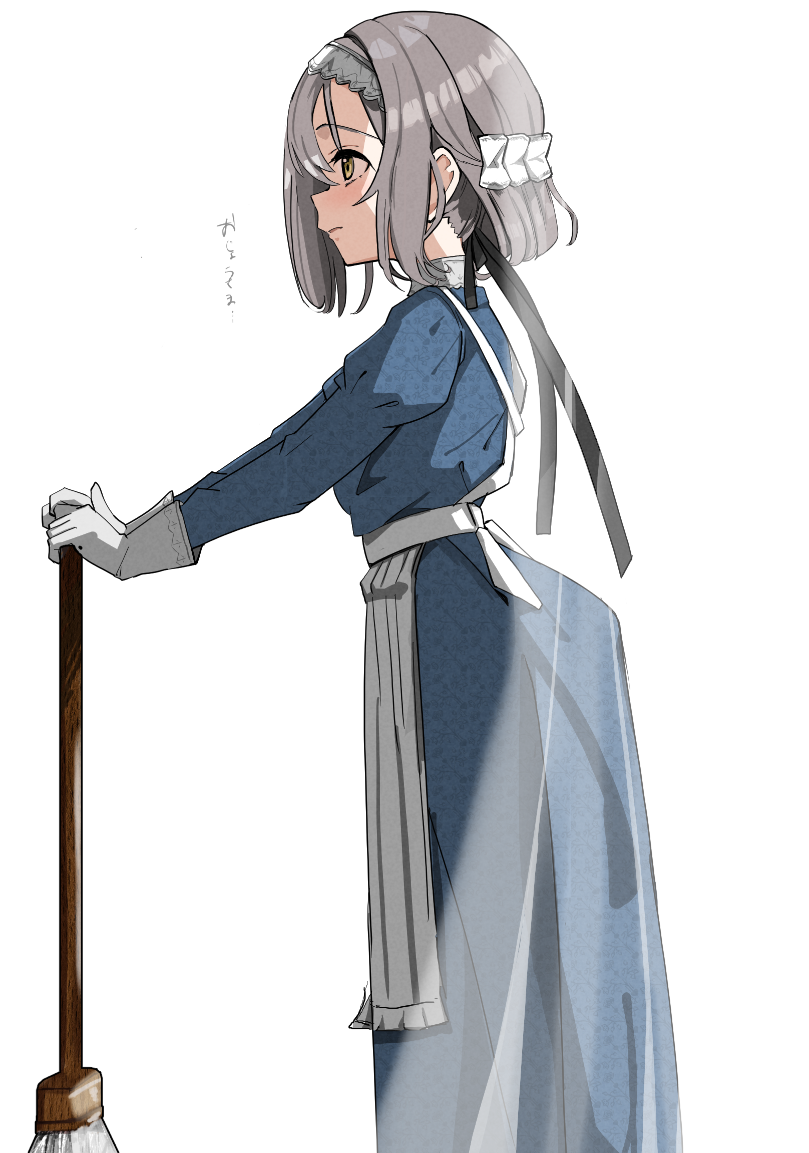 1girlapronblack ribbonblue dressdressfrilled apronfrillsglovesgreen eyesgrey hairhair ribbonholdingholding moplong sleevesmaidmaid headdressmoppuffy sleevesribbonshort hairsolowaist apronwhite apronwhite gloves
