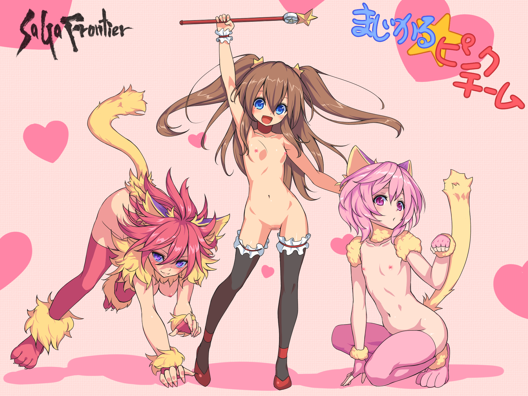 3girlsanimal earsblue eyesblushbreastsbrown hairfemaleFlag for Deletionlooking at viewermagical girlmonster girlmultiple girlsnavelnipplesnudeopen mouthpink hairpurple eyesred hairsmiletail