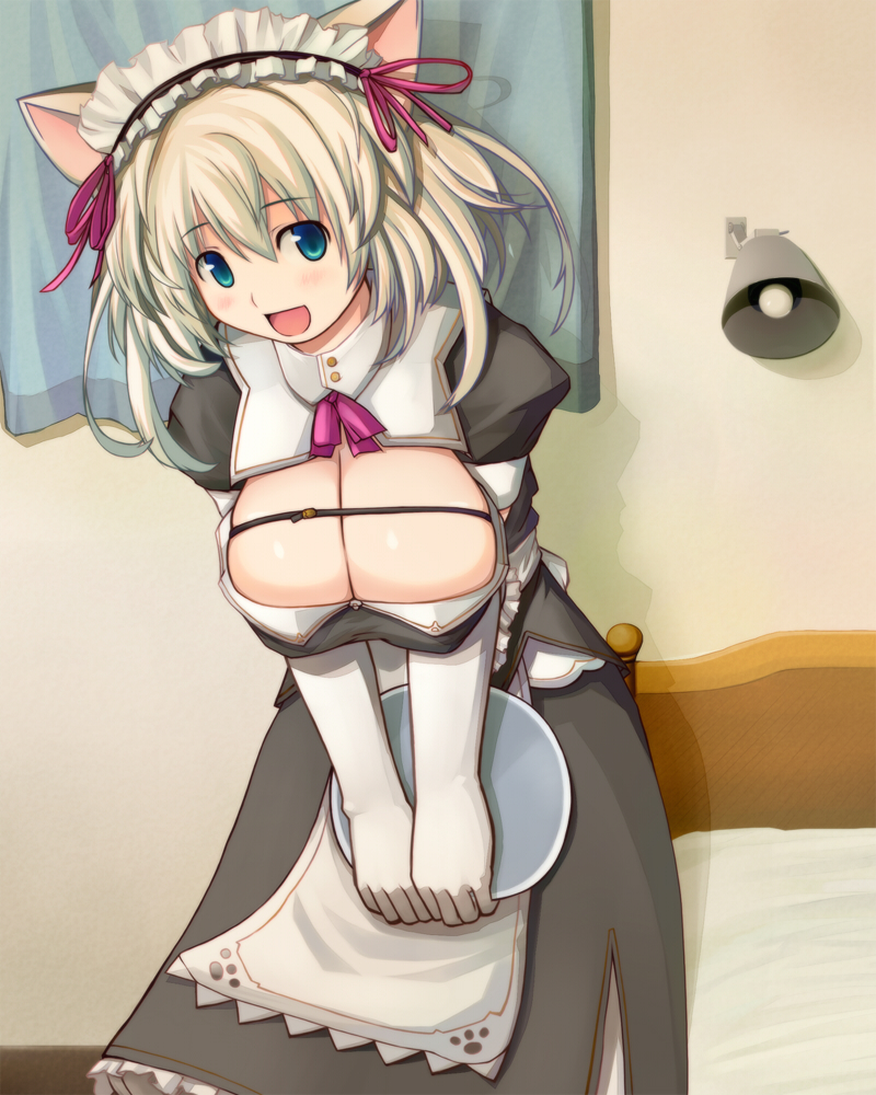 :d1girlanimal earsbedbedroomblonde hairblushbreastscat earscat girlcleavagedresselbow glovesfemale focusglovesgreen eyeshuge breastsindoorslooking at viewermaidmaid headdressopen clothesopen dressopen mouthpaw printsmilesolostanding